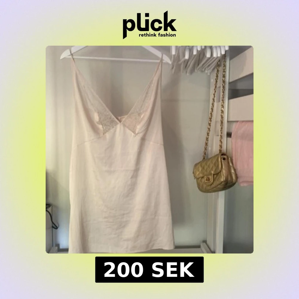Säljer en champagnefärgad slipklänning med tunna axelband och v-ringning. Klänningen har fina spetsdetaljer framtill och baktill samt en liten öppning i ryggen. Perfekt för sommarens varma dagar.