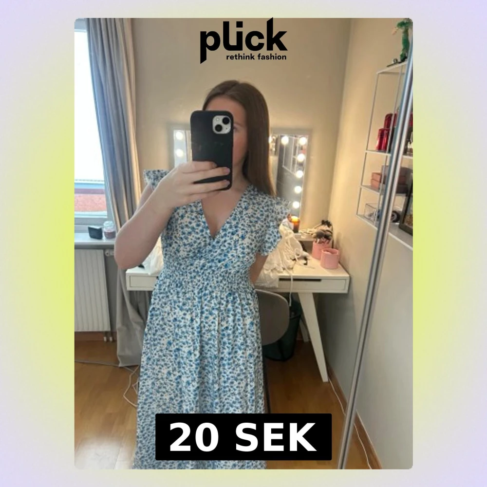 Superfin långklänning med blått blommönster på vit botten. Klänningen har v-ringning, smock i midjan och volangärmar som ger en romantisk känsla. Perfekt för sommarens alla tillfällen! Materialet känns lätt och luftigt.