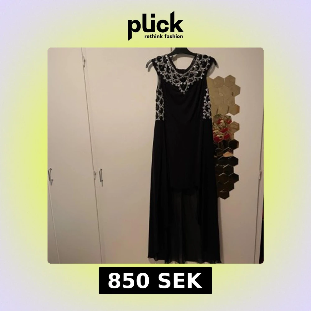 Säljer en svart långklänning med ärmlös design och transparent nederdel. Överdelen är dekorerad med glittrande pärlor i ett snyggt mönster som ger en lyxig känsla. Perfekt för bal eller fest. Klänningen har rund halsringning och faller snyggt längs kroppen.