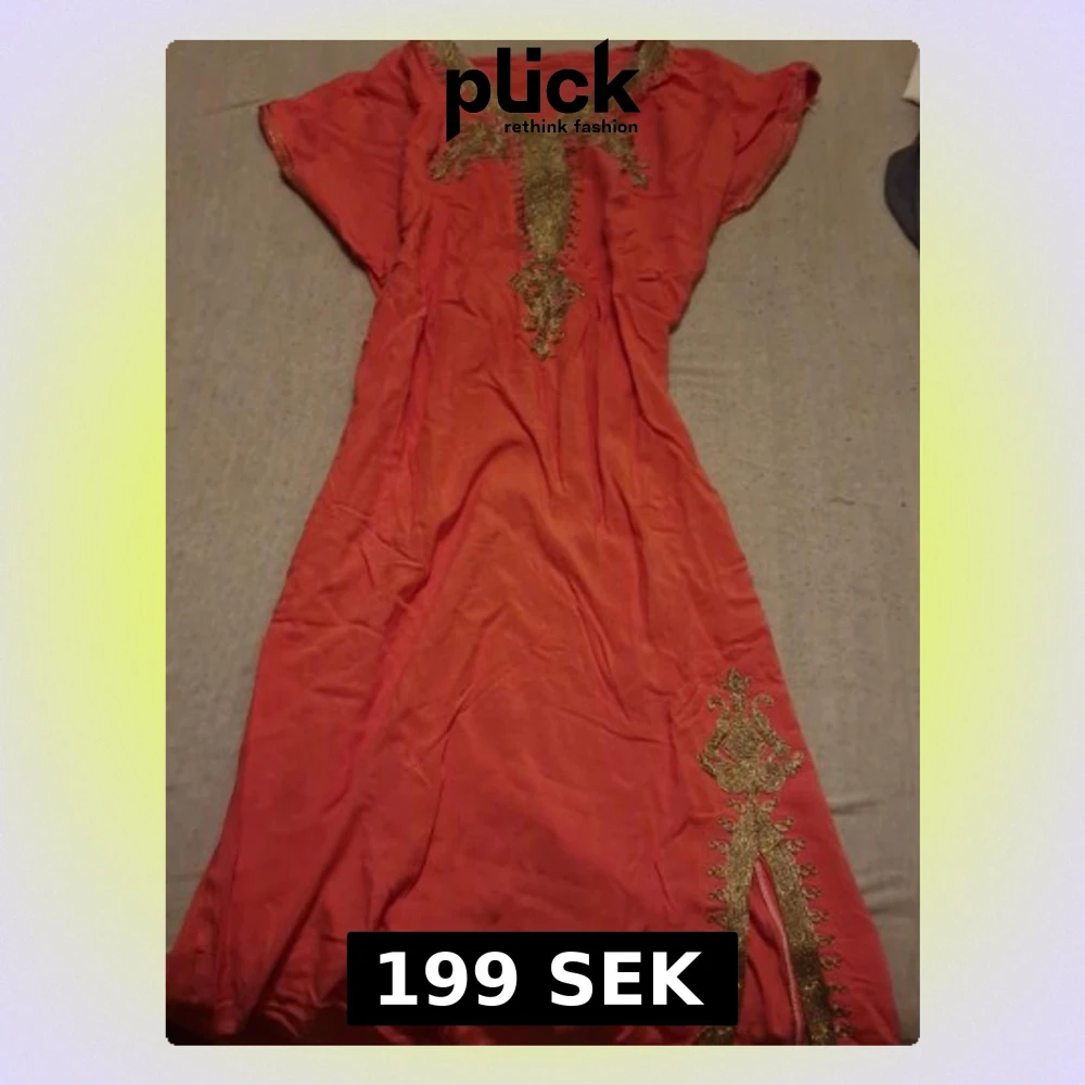 Unik långklänning i korall med detaljerade guldbroderier längs v-ringningen och slitsen. Klänningen har korta ärmar och ett elegant orientaliskt mönster som verkligen sticker ut. Perfekt för dig som vill ha något speciellt till festen. Köpt i tunisien, det ämnen traditionell tunisisk klänning som heter kaftan, används för varma klimat, perfekt för dig som vill på resa till ett tropiskt område. Priset som står gäller, kan möjligtvis diskuteras🫶