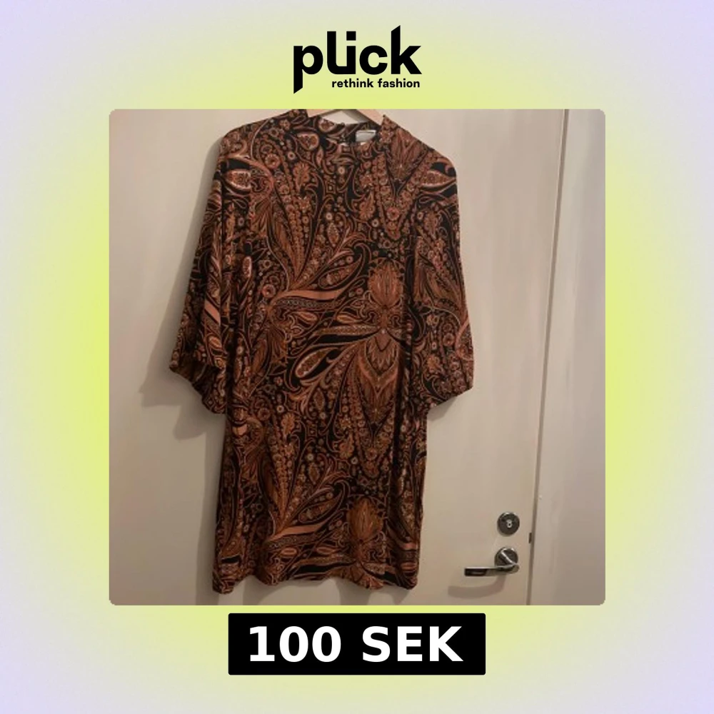 Snygg klänning med ett unikt mönster i svart och orange från H&M x Richard Allan. Klänningen har trekvartsärmar och en lös passform, perfekt för en stilfull look. Materialet känns mjukt och bekvämt mot huden.