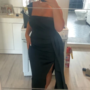 Svart festklänning  - Säljer den här otroligt fina satin klänningen i svart. Endast använd en gång men väl använd och har inga defekter! Skriv om du vill ha fler bilder eller andra frågor💕