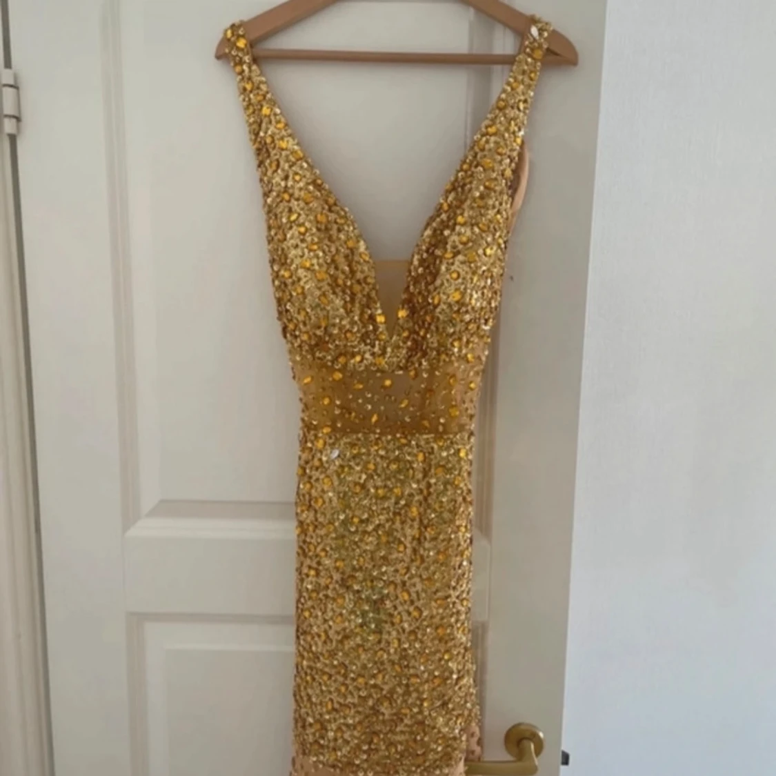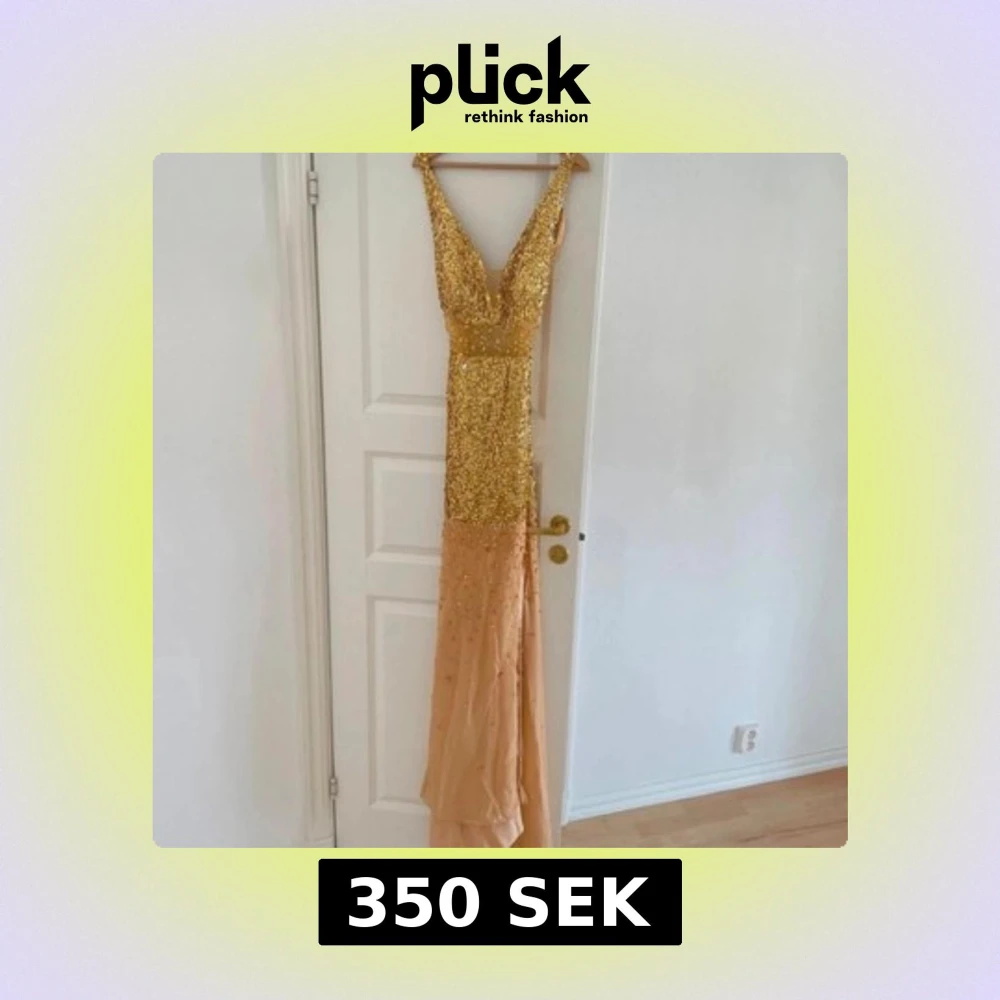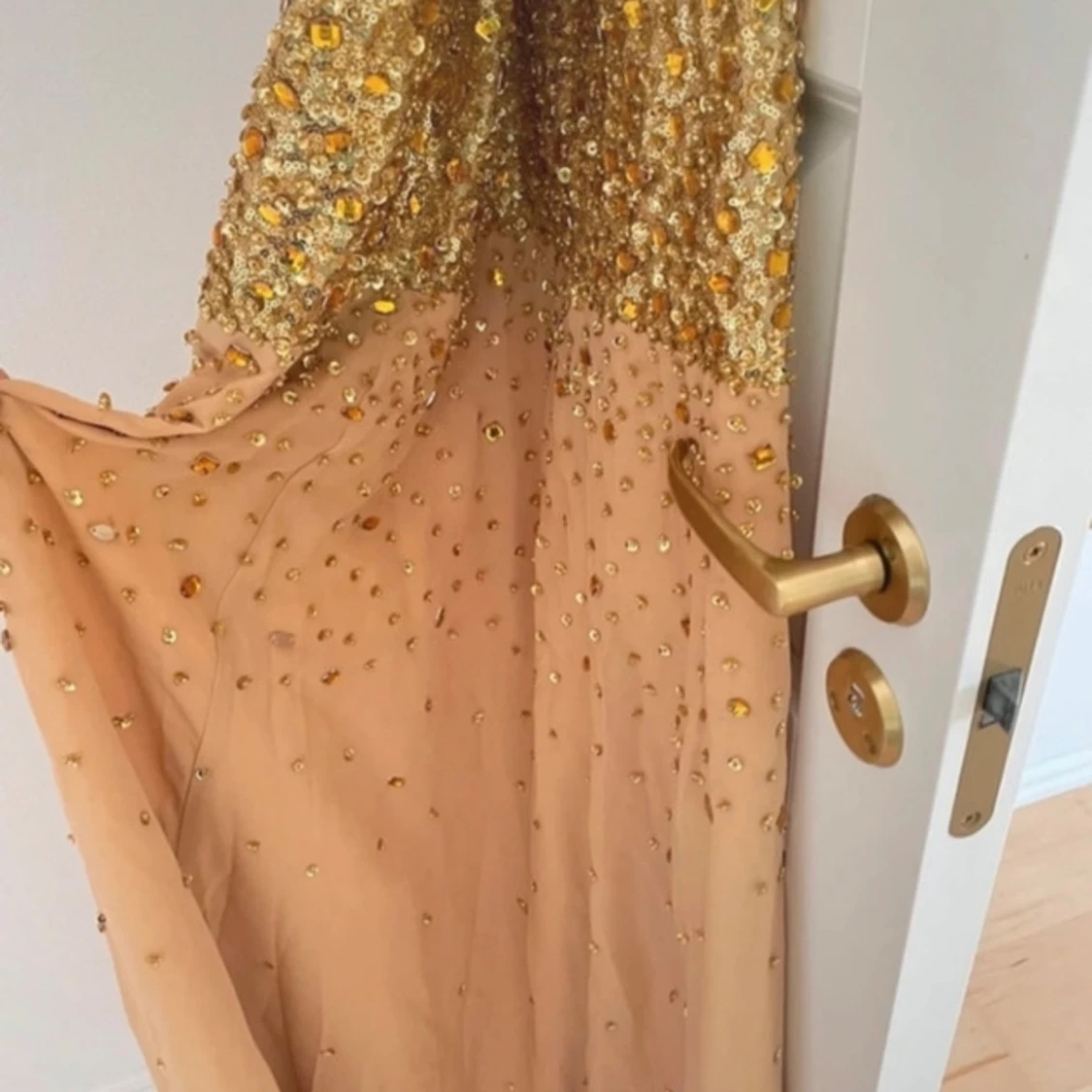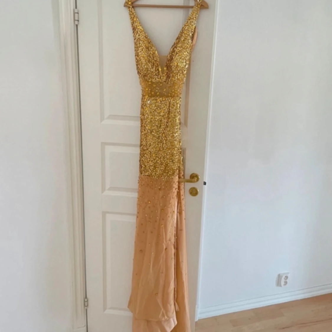 Säljer en maxad långklänning med djup v-ringning, täckt av guldiga paljetter och stenar upptill och överdelen. Nederdelen är i champagnefärgad, tunn mesh med glittrande detaljer. Klänningen är ärmlös och har en figurnära passform som ger en riktigt glam känsla.