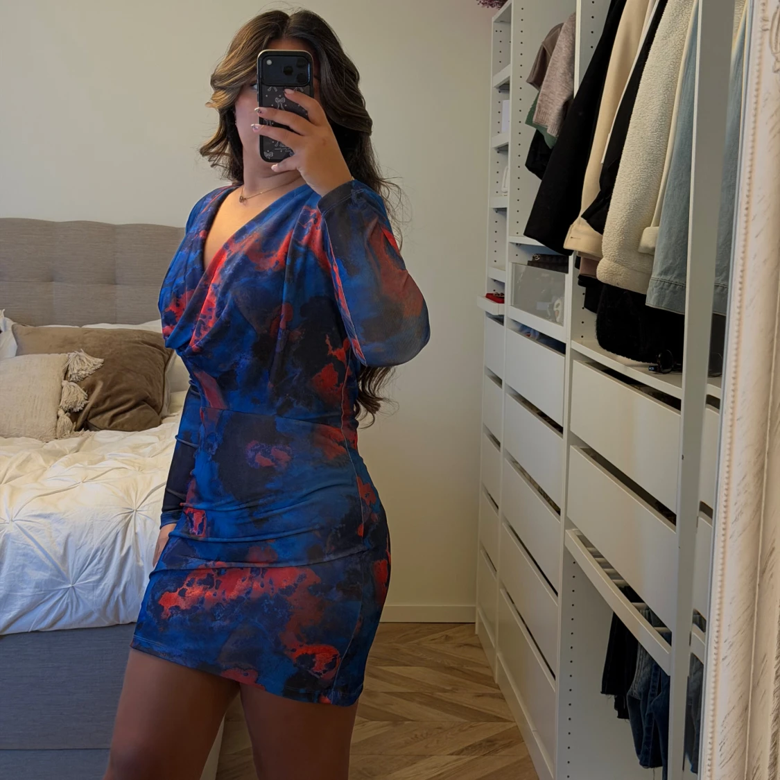 Säljer en kort, tight klänning i mesh med blått och rött abstrakt mönster. Klänningen har lång ärm, draperad v-ringning och snörning i sidan. Sitter snyggt figurnära och är perfekt för dig som gillar färg och unika detaljer.