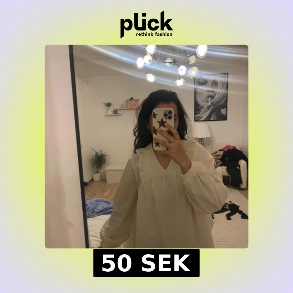 Säljer en söt och flowy ljus beige klänning med v-ringning och volangdetaljer vid axlarna. Klänningen har långa puffärmar med resår vid ärmslut och en avslappnad passform. Perfekt för dig som gillar romantiska och luftiga plagg.