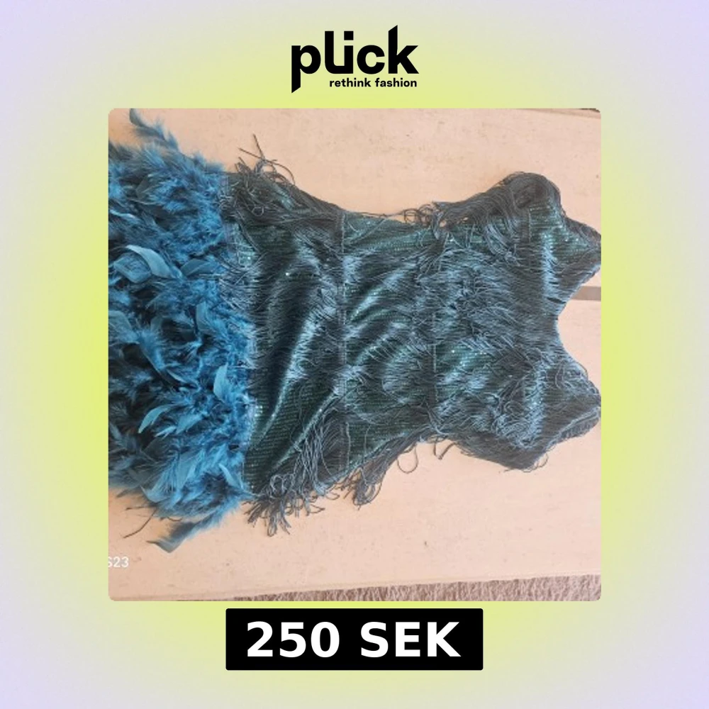 Supersnygg blå kortklänning med glittriga paljetter, fransar över hela klänningen och massor av fjädrar nertill. Perfekt för dig som vill sticka ut och älskar detaljer! Klänningen har en tight passform och är riktigt festlig.