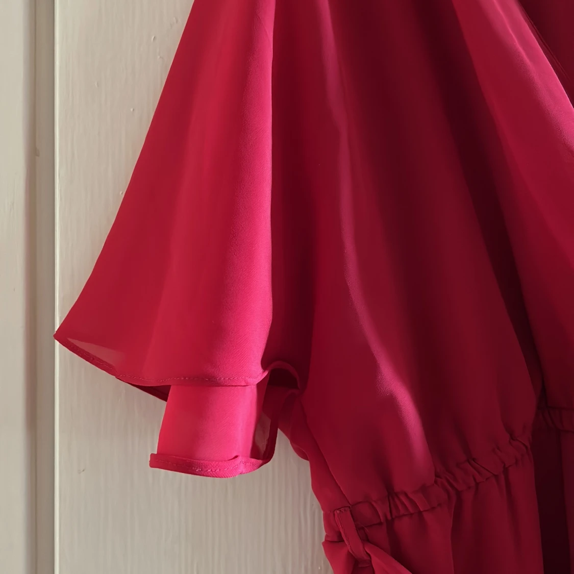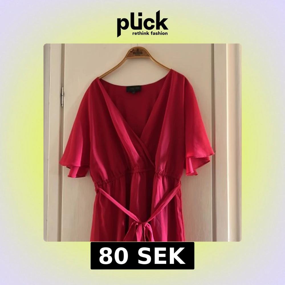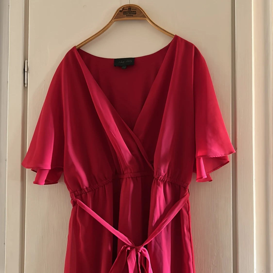 Snygg röd kortklänning från Bubbleroom med omlott-design och v-ringning. Klänningen har luftiga korta ärmar, knytband i midjan och volangdetalj längst ner. Materialet är mjukt och lätt, perfekt för varma dagar. Passformen är normal och ger en skön siluett.