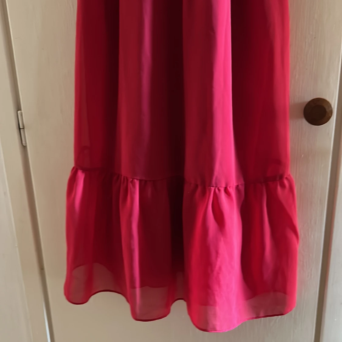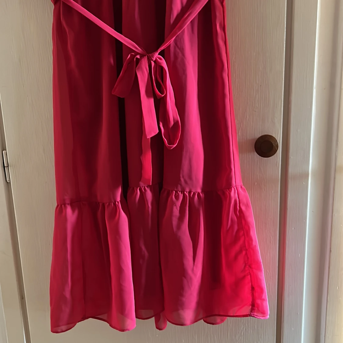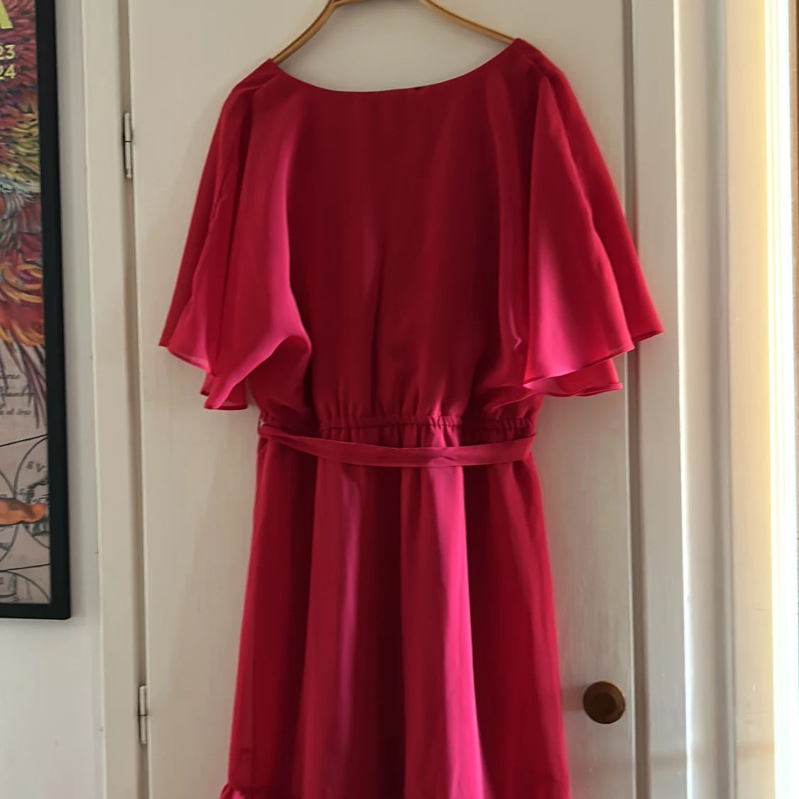 Snygg röd kortklänning från Bubbleroom med omlott-design och v-ringning. Klänningen har luftiga korta ärmar, knytband i midjan och volangdetalj längst ner. Materialet är mjukt och lätt, perfekt för varma dagar. Passformen är normal och ger en skön siluett.