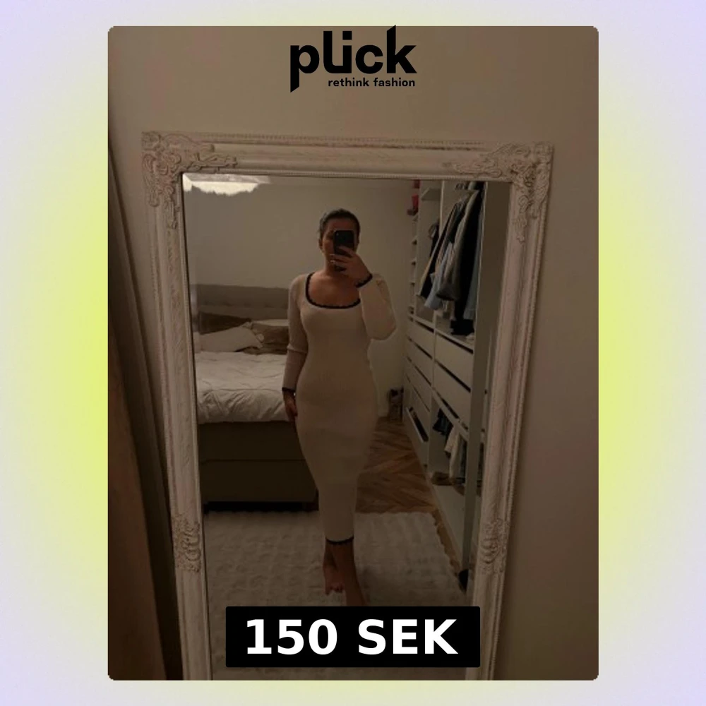 Säljer en beige ribbad långklänning med lång ärm och tight passform. Klänningen har fyrkantig ringning och svarta vågiga detaljer vid halsringning och nederkant. Perfekt för dig som gillar stilrena och trendiga plagg.