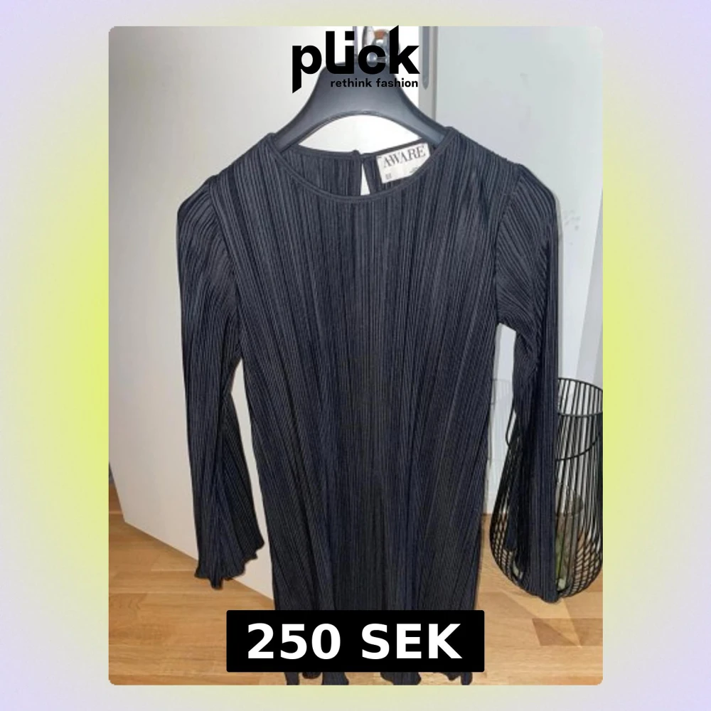 Säljer en svart plisserad klänning från AWARE med långärmad design och rund hals. Klänningen har en snygg plisserad struktur och är i ett mjukt, stretchigt material som ger en bekväm passform. Använd 1 gång.