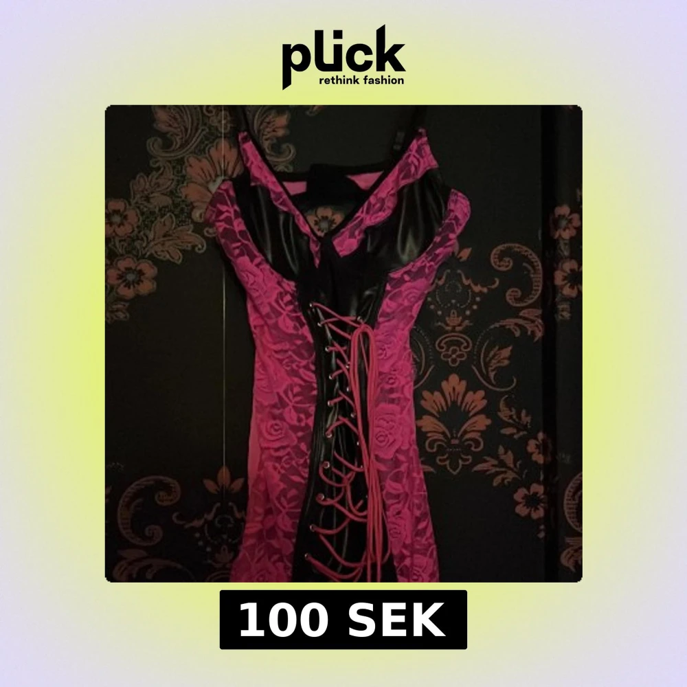 Snygg kort rosa klänning med svarta detaljer från Seven 'til Midnight. Klänningen har blommig spets, snörning framtill och en cool v-ringning. Materialet är en mix av spets och syntet, perfekt för dig som vill sticka ut.