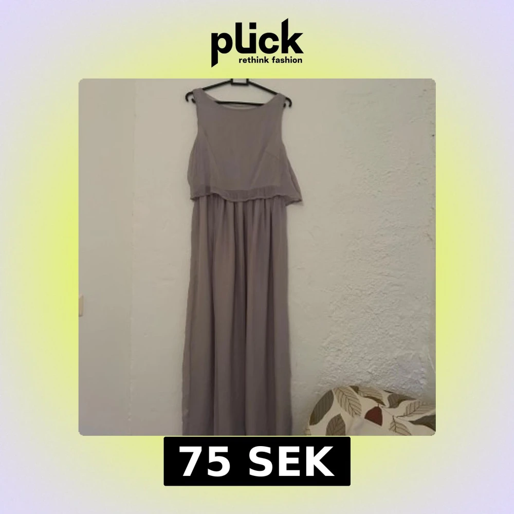 Säljer en ljusgrå långklänning med öppen rygg. Hittar inge lapp men gissar på att den är i storlek M/L