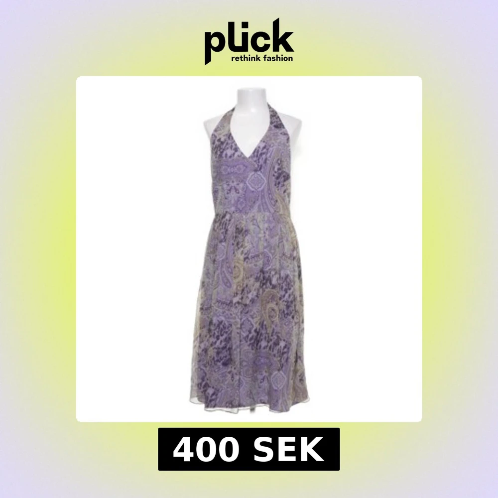 Säljer en lila halterneckklänning från David Meister med paisleymönster i lila, beige och grå toner. Klänningen har omlott-v-ringning och är ärmlös med ett lätt, glansigt foder. Perfekt för sommarens tillfällen!