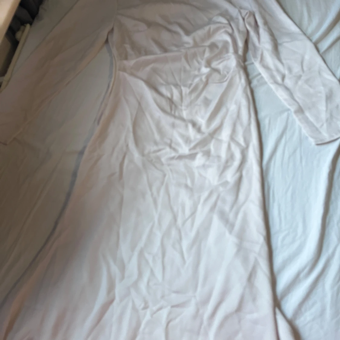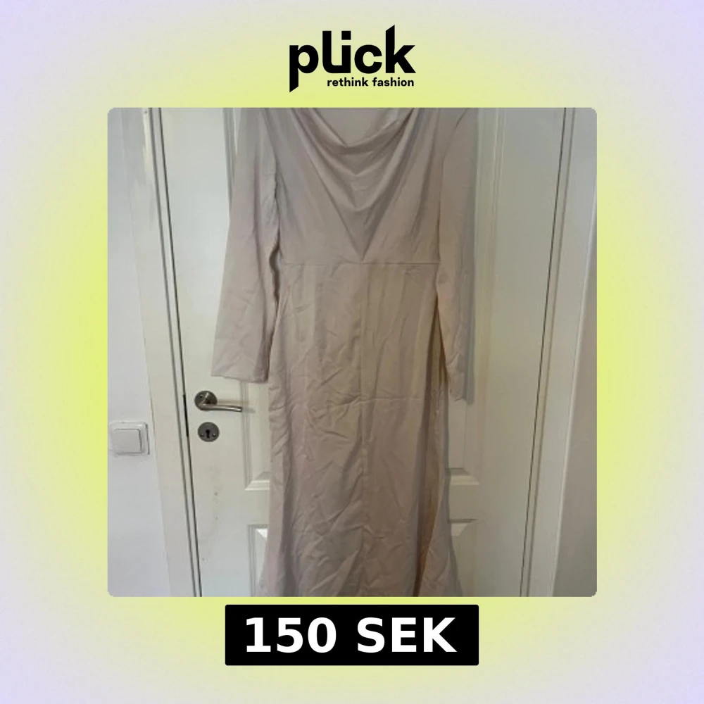 Elegant ljusbeige långklänning med draperad halsringning och långa ärmar. Klänningen har en mjuk, flytande passform och är perfekt för speciella tillfällen. Enkel och stilren design som ger en sofistikerad look.