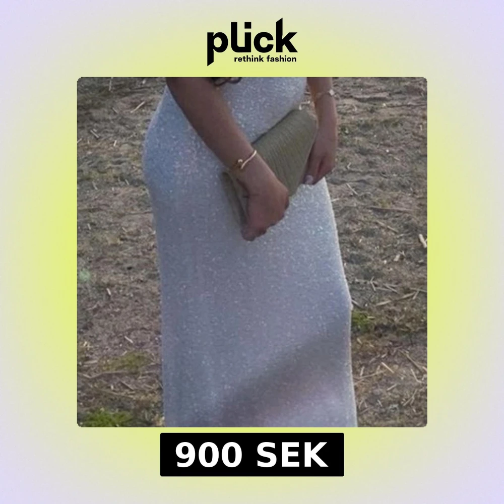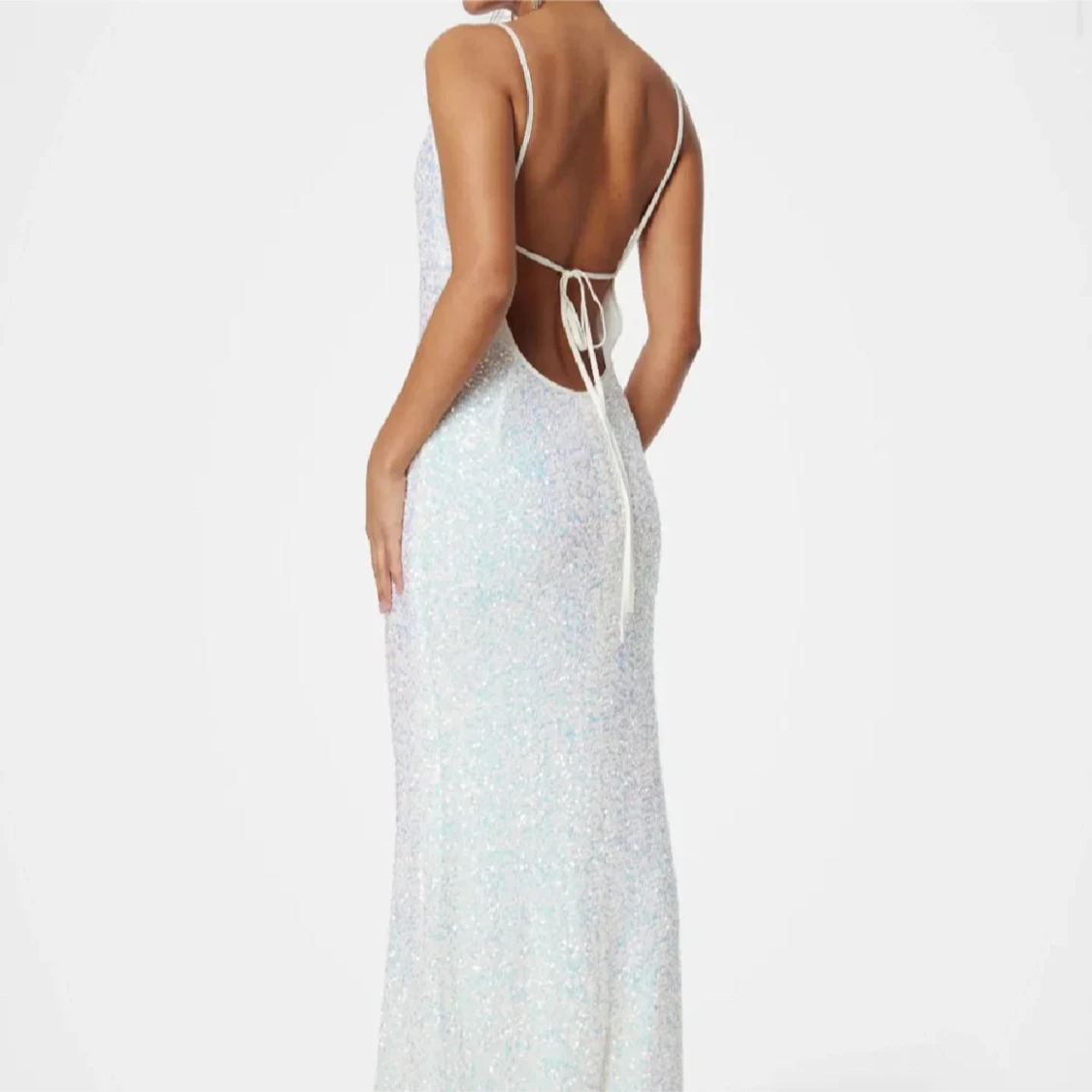Supersnygg långklänning i vitt med glittrigt tyg och smala axelband. Klänningen har öppen rygg med snörning och en figurnära passform som ger en elegant siluett. Perfekt för dig som vill sticka ut och glänsa på nästa stora tillställning!
