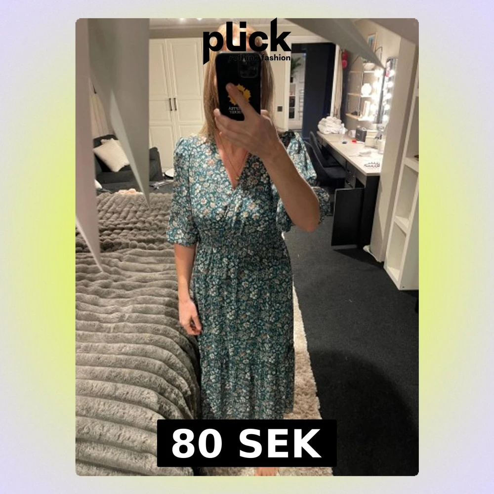 Säljer en snygg långklänning med blommigt mönster i grönt, vitt och beige. Klänningen har v-ringad omlottfront, puffiga korta ärmar och smock i midjan för en skön passform. Perfekt för dig som gillar romantisk stil och vill ha något luftigt och bekvämt.