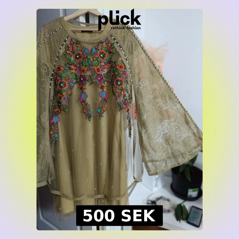 Superfin beige klänning med färgglad broderad blommig design och pärldetaljer. Vida spetsärmar och transparent mesh ger en lyxig känsla. Perfekt för dig som vill sticka ut med unika detaljer och färger. Märke: Zahra Rubab.