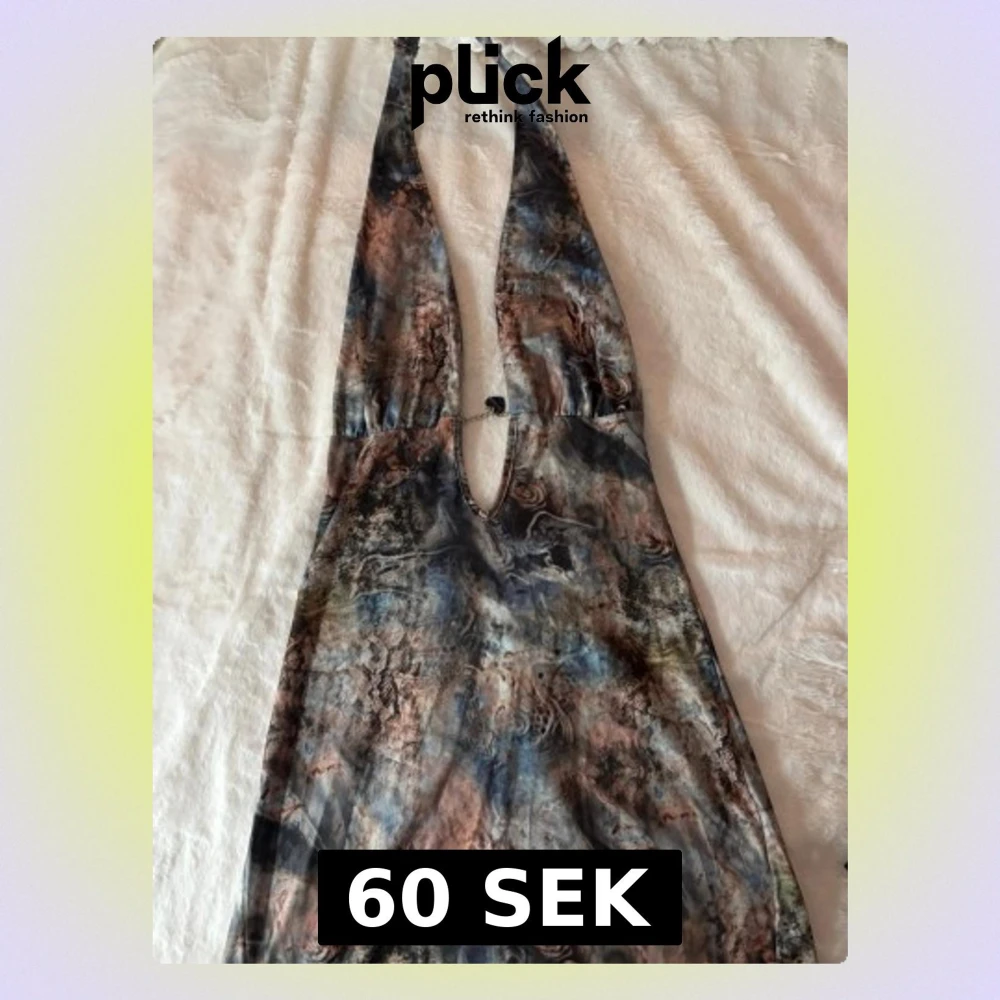Lånklänning från Shein med mönster i blått, brunt och grått. Klänningen har halterneck med knyt i nacken, djup v-ringning och ett hjärtformat smycke framtill. Oanvänd