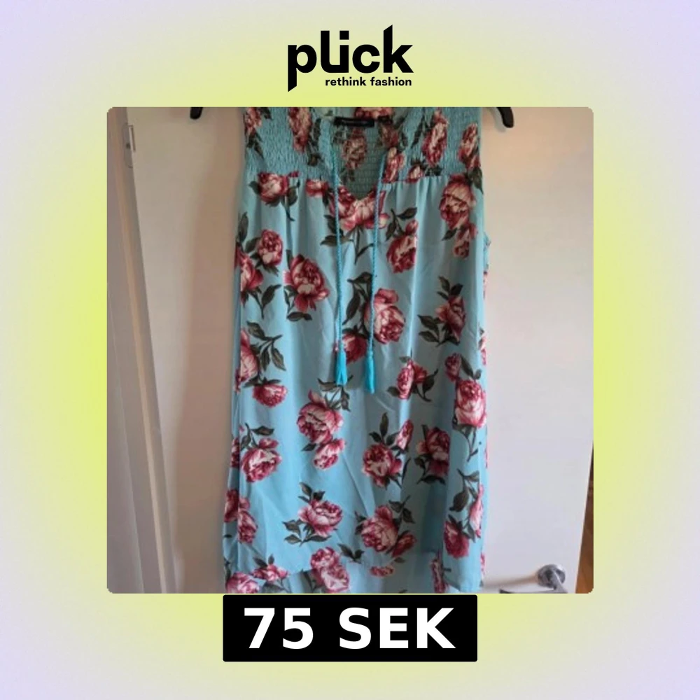 Säljer en ljusblå klänning med rosa och röda blommor från Mywearwoman. Klänningen har smock upptill, snörning vid halsen och är ärmlös. Materialet är mjukt och lätt, perfekt för varma dagar. Passformen är loose och längden är kort.
