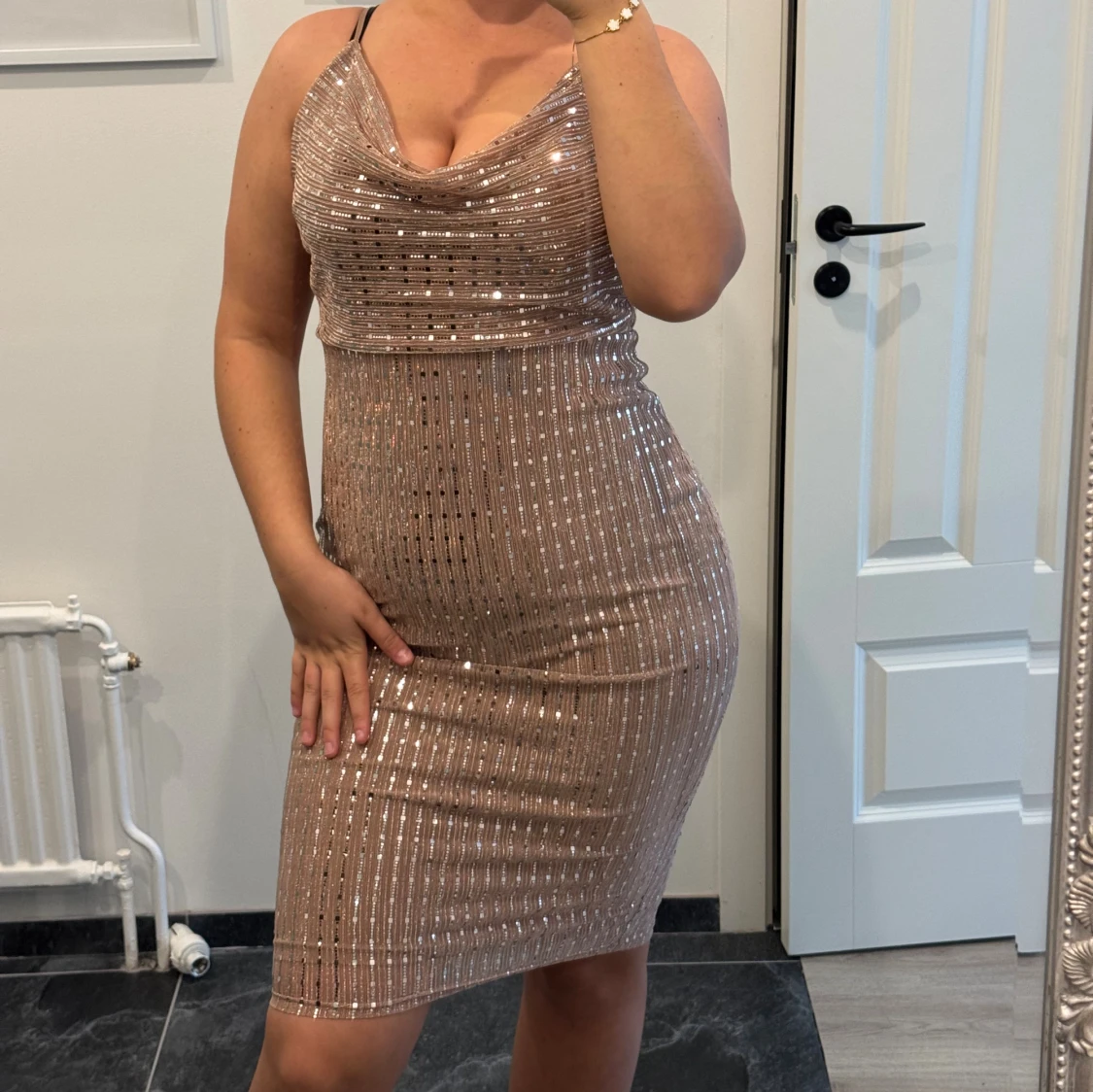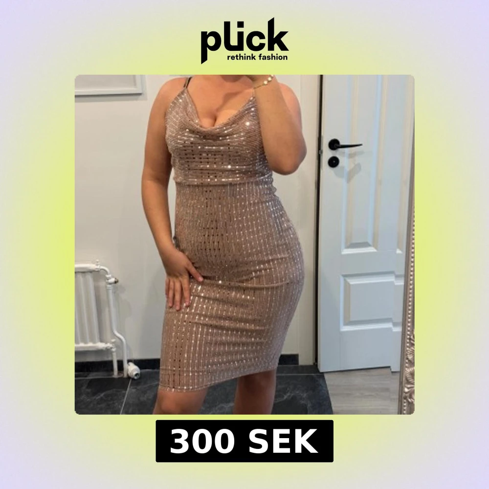 Säljer en superfin glittrig kortklänning i champagnefärg med smala axelband och snygg draperad urringning. Klänningen har ett figurnära snitt och är täckt av paljetter som ger en riktigt festlig look. Perfekt för dig som vill sticka ut och glänsa!