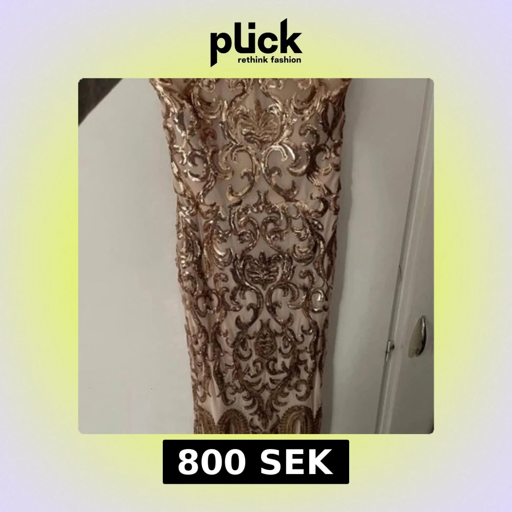 Säljer en elegant långklänning i champagnefärg med glittriga paljetter och detaljerat mönster. Klänningen har en figurnära passform och är ärmlös, perfekt för bal eller fest. Materialet är troligtvis polyester med paljettapplikationer för extra lyxig känsla. Använd bara en gång