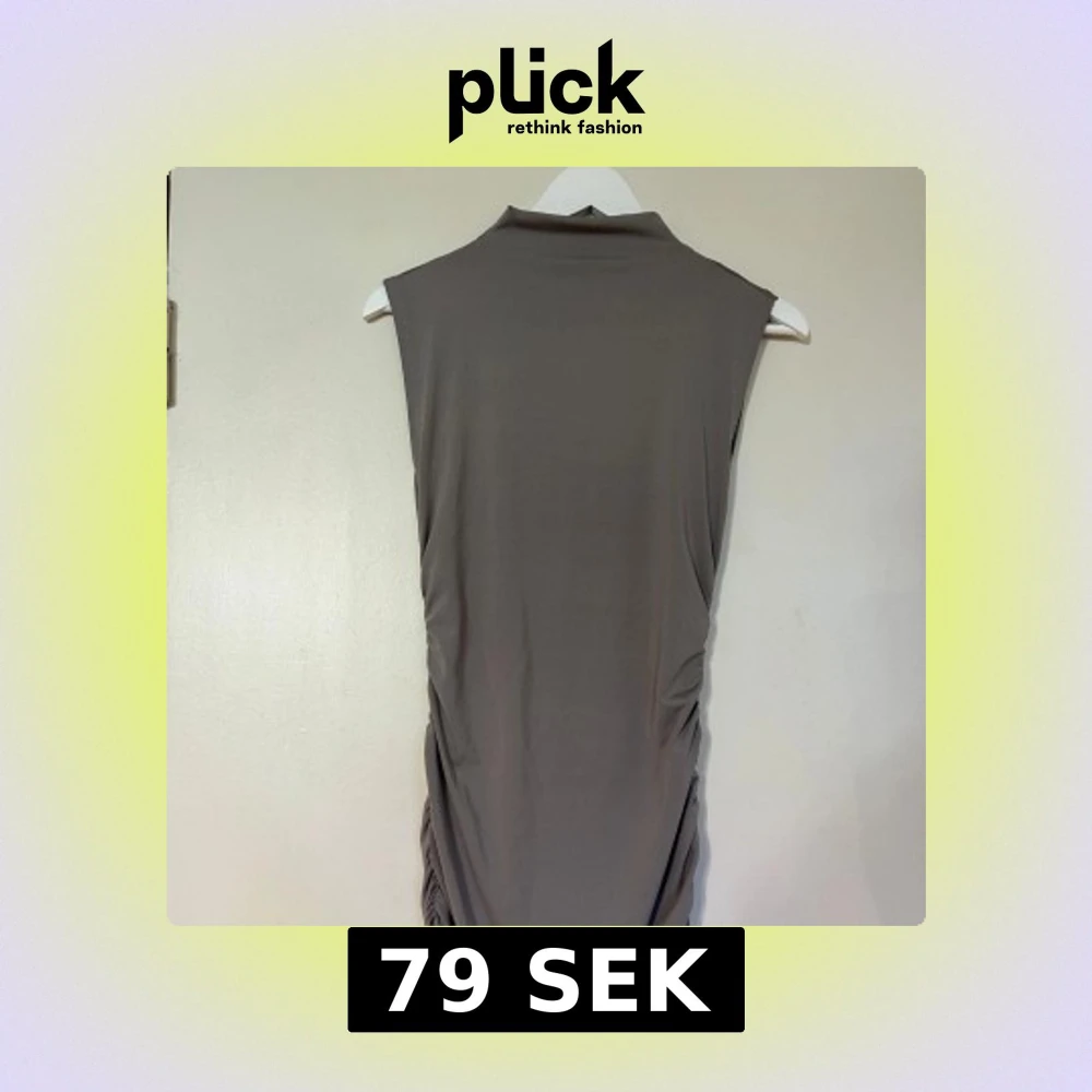 Snygg grå ärmlös klänning med hög krage och rynkade detaljer på sidorna. Perfekt för en stilren look.