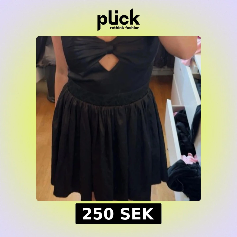 Supersöt svart axelbandslös kort klänning i satin med stor rosettdetalj framtill och cut-out under bysten.
