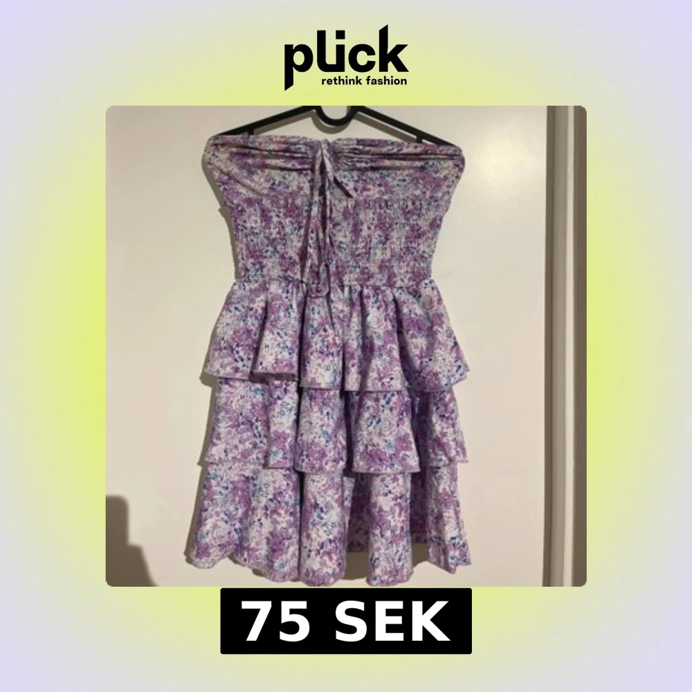 Supersöt kort klänning med lila och vita blommor, volanger i flera lager och smock upptill. Kan bäras axelbandslös eller med smala axelband tack vare knytningen. Perfekt för sommarens alla tillfällen!