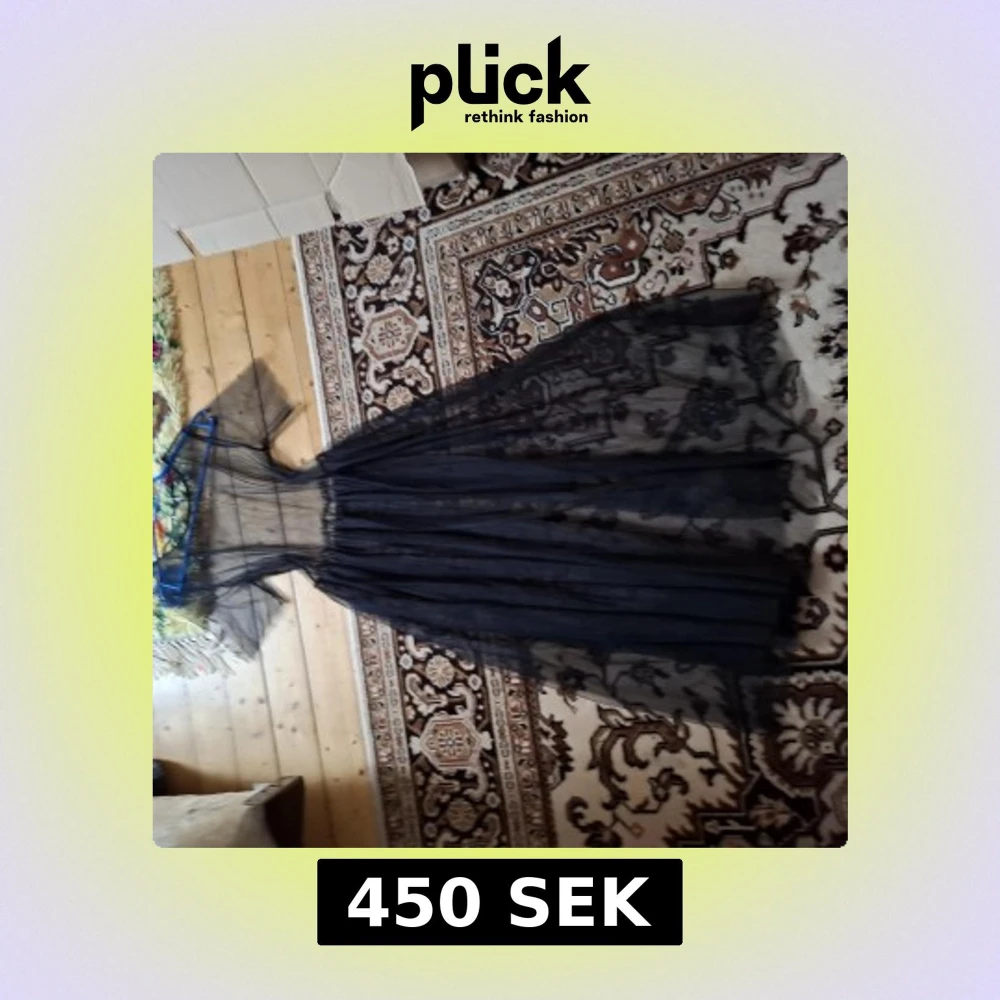 Säljer en svart långklänning i transparent mesh med blommiga broderier. Klänningen har korta ärmar och markerad midja, perfekt för dig som vill sticka ut med en unik och elegant look.
