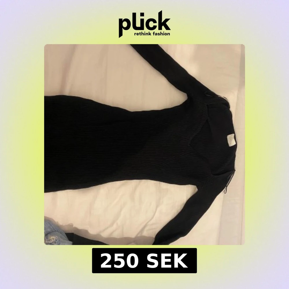 Snygg svart ribbad klänning med lång ärm och figurnära passform. Klänningen har v-ringad hals och är tillverkad i ett stretchigt material som sitter tight och markerar siluetten. Perfekt för dig som gillar en stilren och enkel look. Storlek M, sitter bra på kroppen, inte för lång eller för kort jag är ca 175 och den är lite över anklarna, bekväm under höst/ vinter