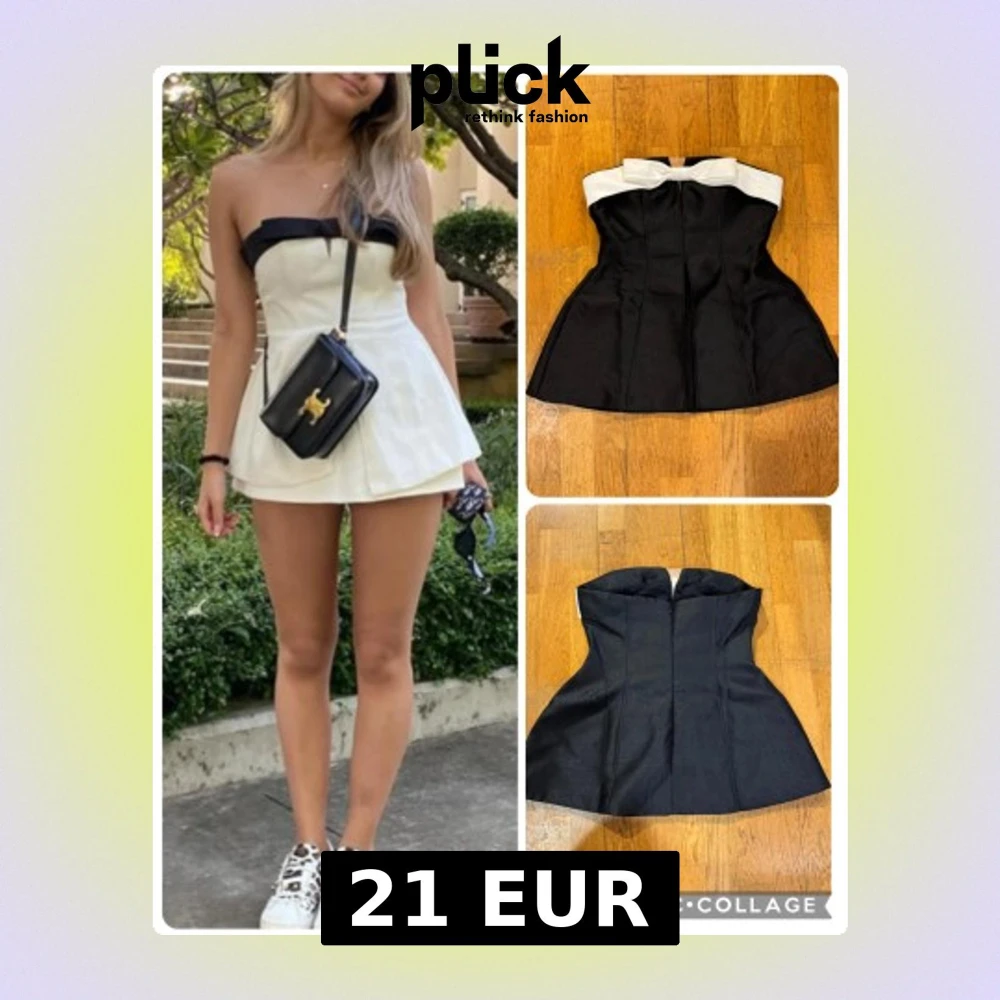 Supersöt kort klänning i svart och vitt med axelbandslös design och en stor vit rosett upptill. Klänningen har en markerad midja och utsvängd kjol, vilket ger en chic och ungdomlig siluett. Materialet är stadigt och håller formen snyggt. Perfekt för dig som vill sticka ut med en elegant look.