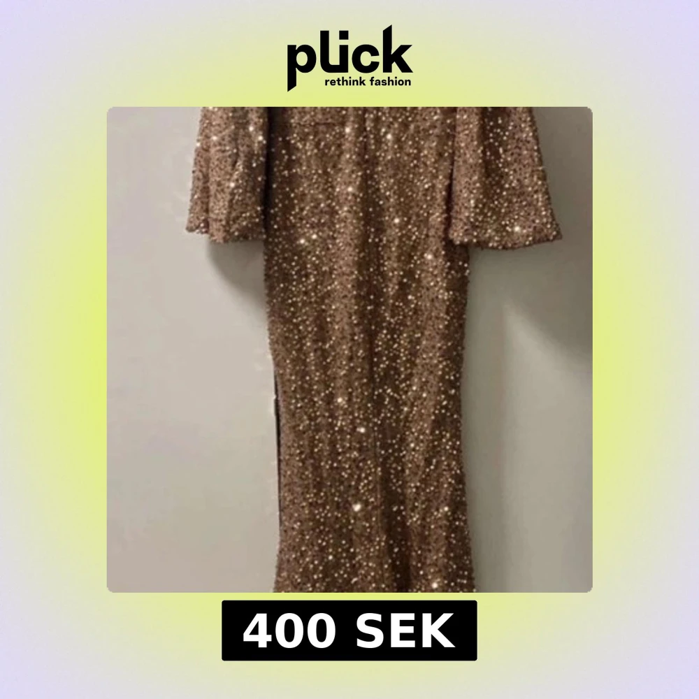Säljer en glittrig guldklänning med trekvartsärmar och rak passform. Klänningen är täckt av paljetter och har en elegant lång siluett, perfekt för speciella tillfällen. Supersnygg att styla med klackar och enkla smycken.