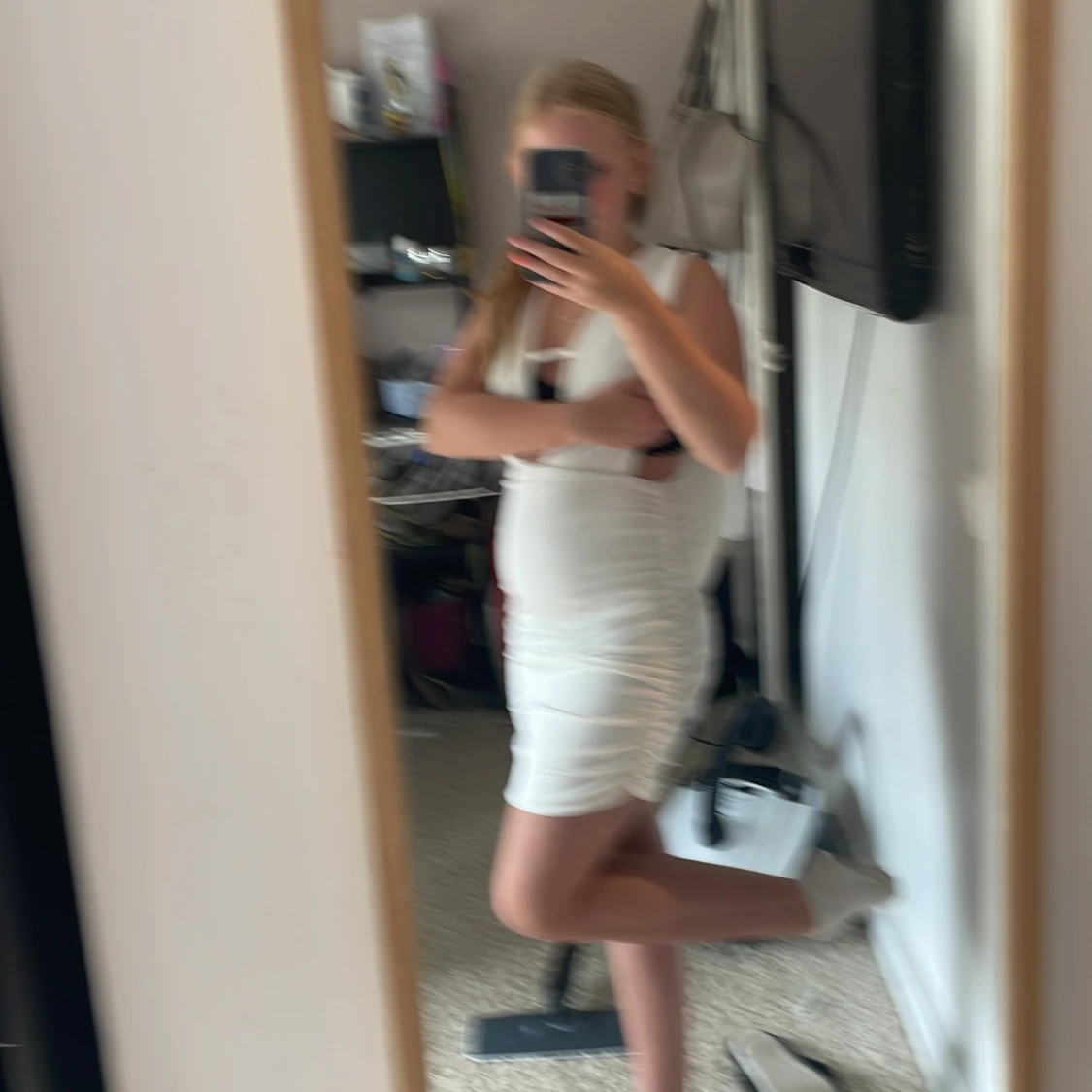 Säljer en vit kortklänning med omlott-design och djup v-ringning. Klänningen är ärmlös och har en tight passform som framhäver figuren. Materialet känns mjukt och stretchigt, perfekt för dig som gillar en clean och stilren look.
