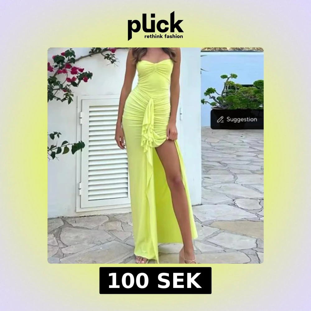 Snygg ljusgul axelbandslös klänning med en smickrande drapering och slits. Perfekt för sommarens fester. Klänningen har en åtsittande passform och en elegant rynkad detalj framtill.