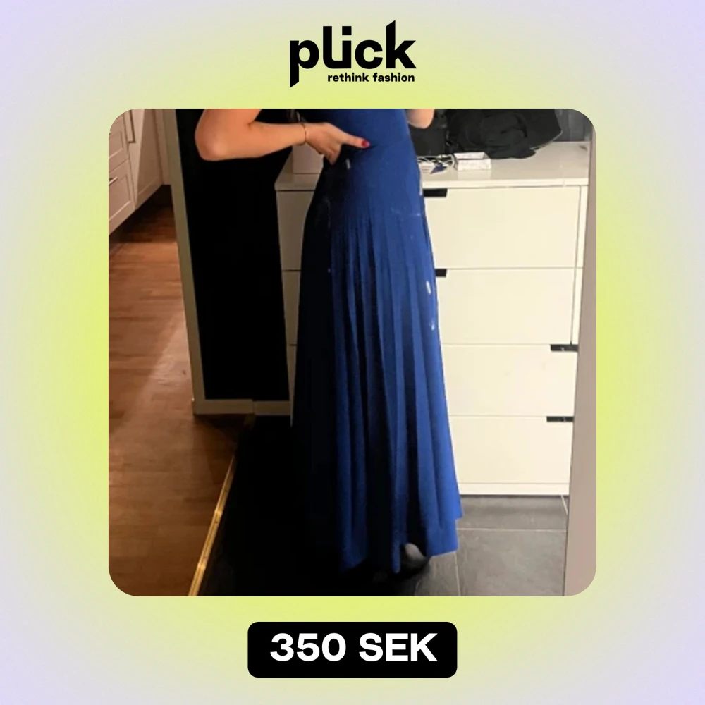 Lång kornblå klänning med plisserad kjol och går upp lite i halsen, dragkedja i rygg, fullt fungernade