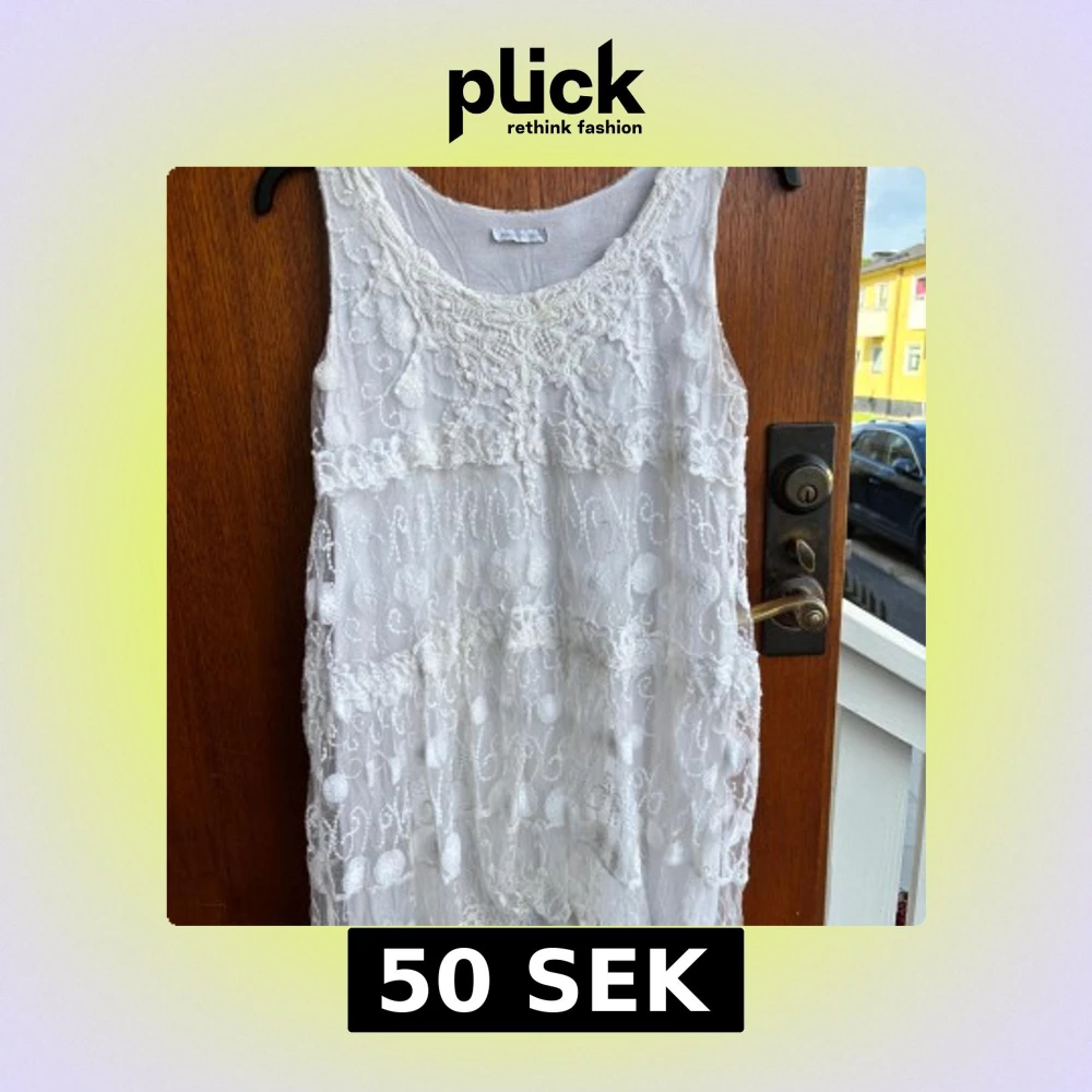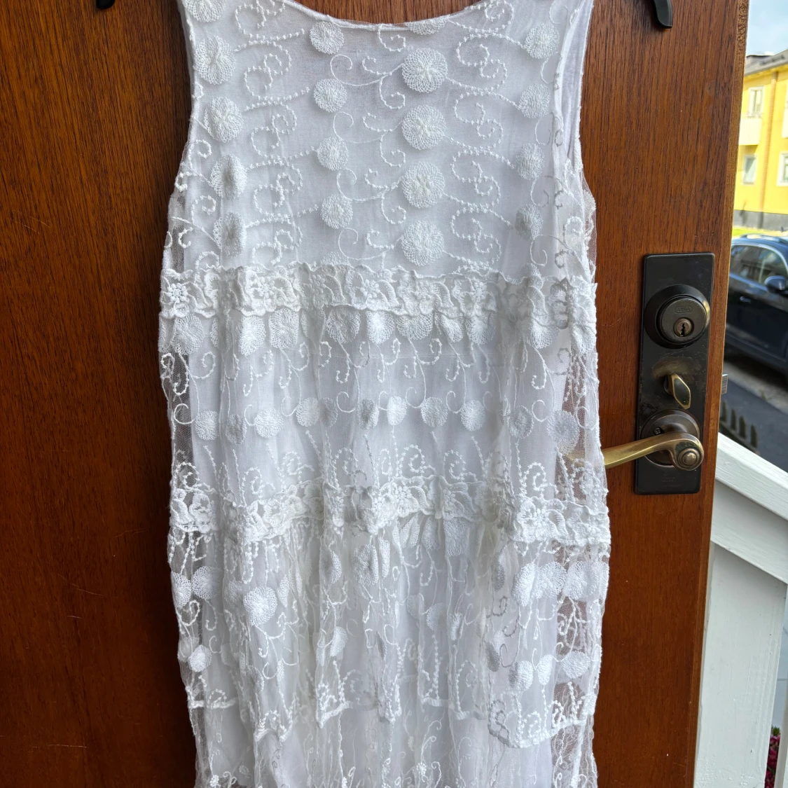 Superfin vit kortklänning i spets med broderade detaljer och ärmlös design. Klänningen har ett romantiskt mönster med prickar och virkad känsla upptill. Perfekt för sommarens alla tillfällen och ger en bohemisk vibe.