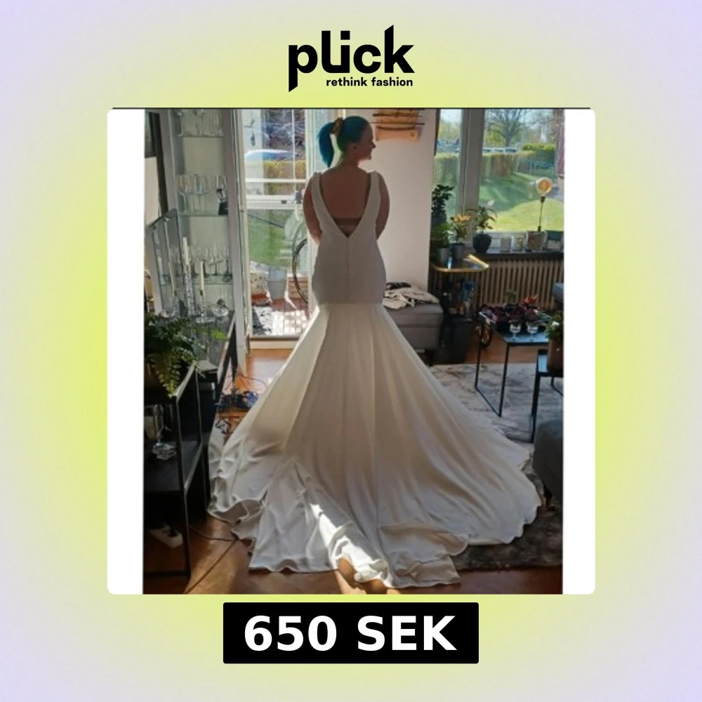 Underbart vacker brudklänning stl M/L. Mermaid stil med super långt släp! Klädda knappar I ryggen. Tung brudsatin tyg (gissar jag på) Förra ägaren hade köpt den på etsy.
