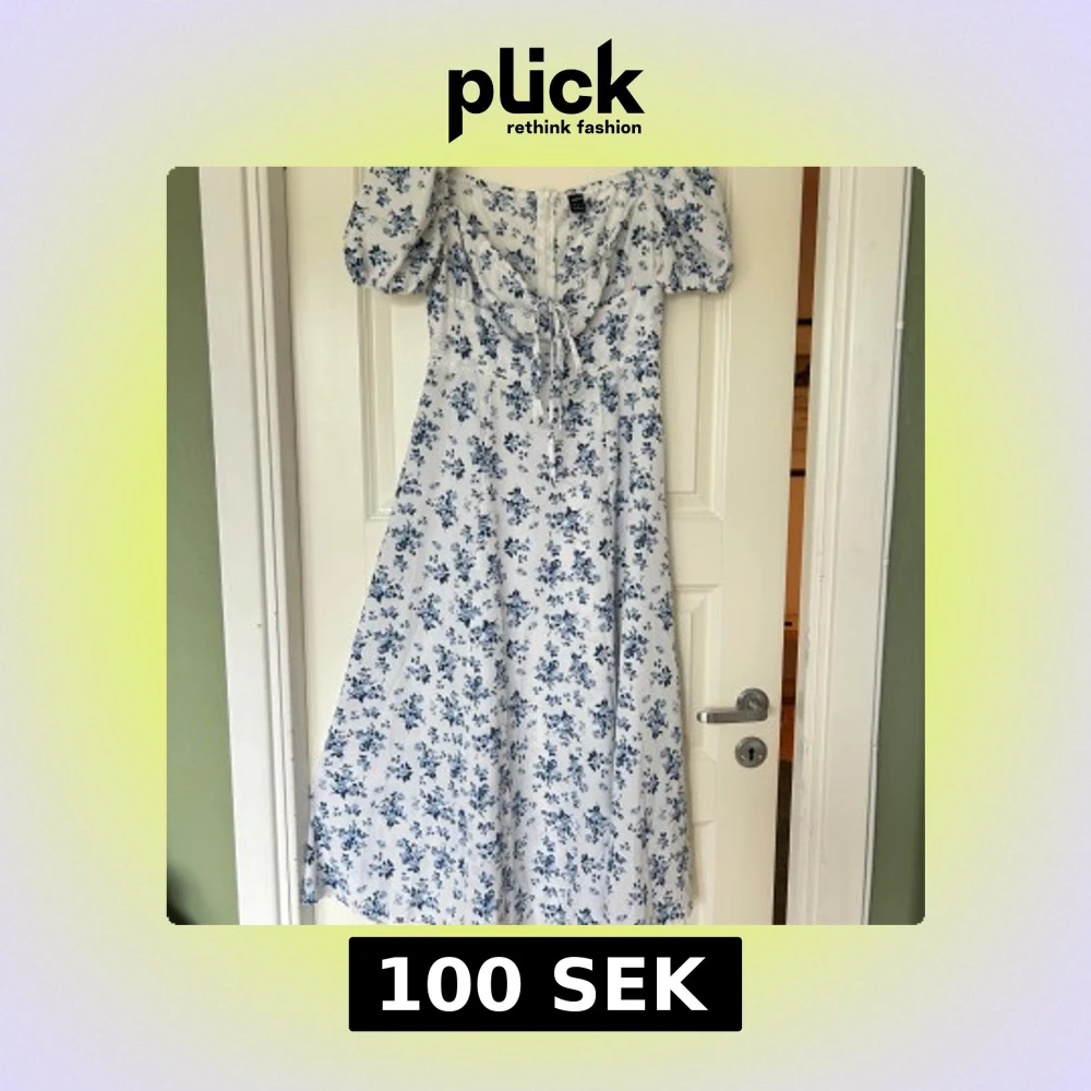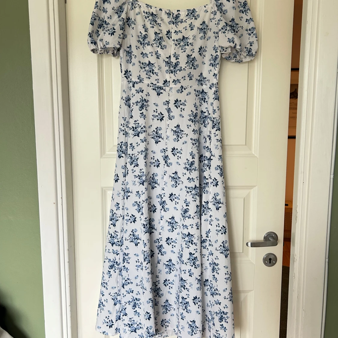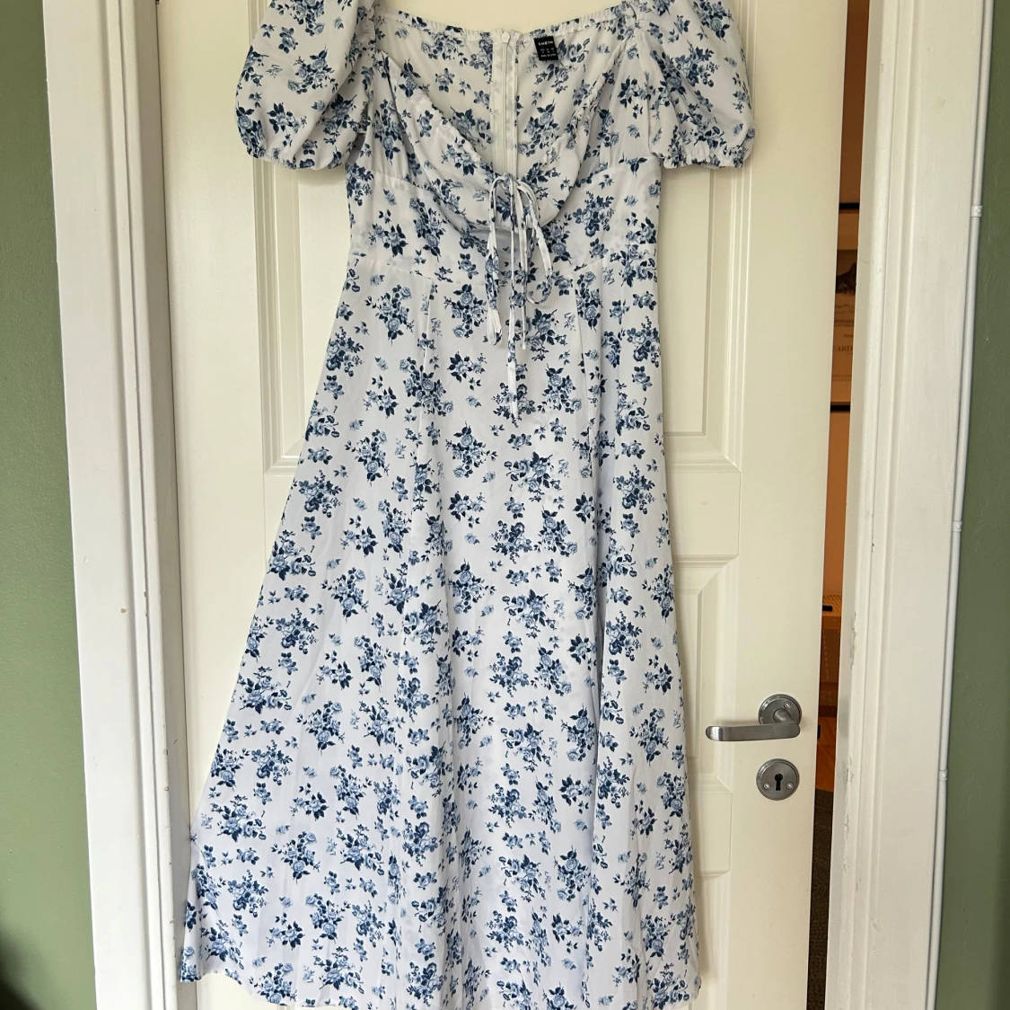 Superfin midiklänning med blått blommönster på vit botten. Klänningen har puffärmar, snörning vid bysten och en romantisk v-ringning. Perfekt flowy passform och lätt material som känns luftigt och somrigt. Når mig halvvägs nedanför knäna (162 cm). Använd 1 gång, köpt second hand.