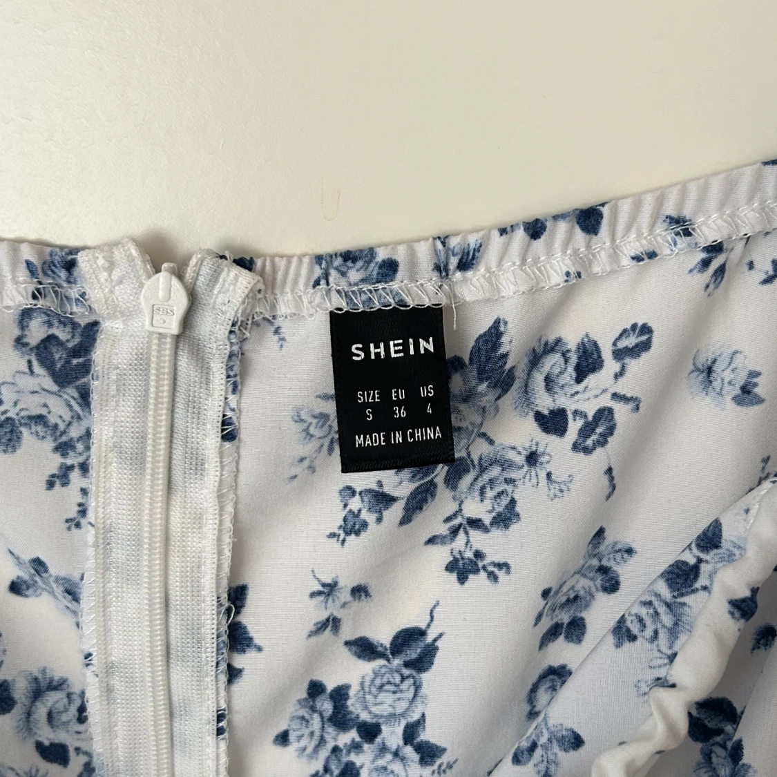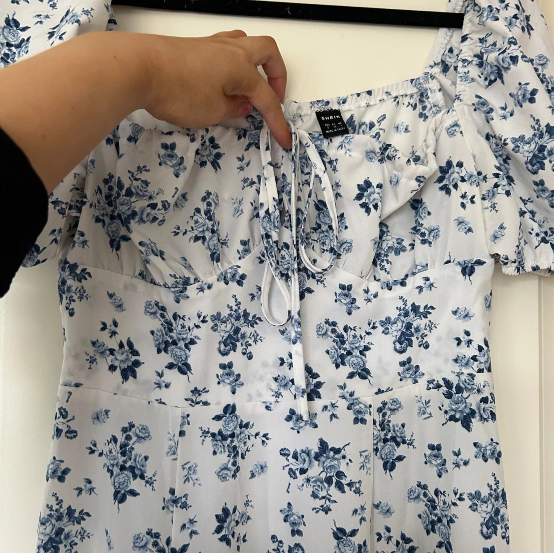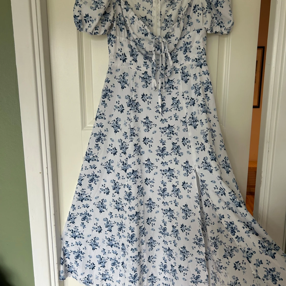 Superfin midiklänning med blått blommönster på vit botten. Klänningen har puffärmar, snörning vid bysten och en romantisk v-ringning. Perfekt flowy passform och lätt material som känns luftigt och somrigt. Når mig halvvägs nedanför knäna (162 cm). Använd 1 gång, köpt second hand.