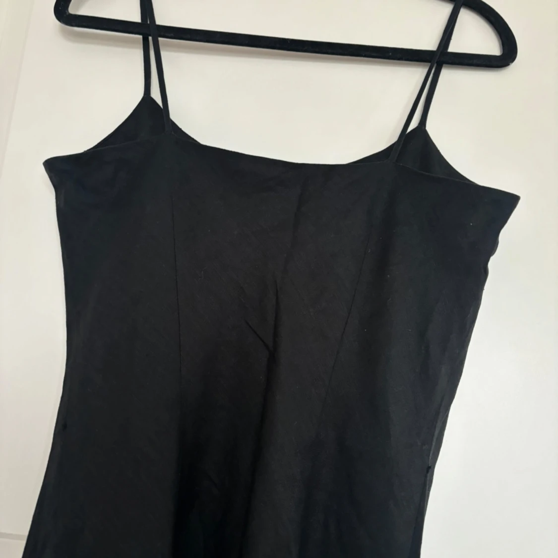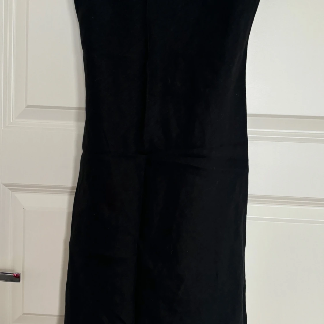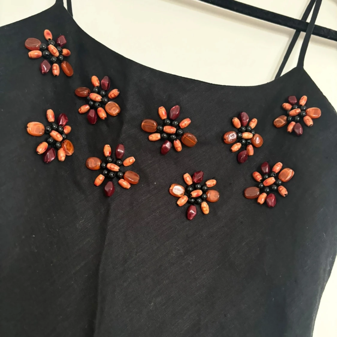Säljer en svart långklänning med smala axelband och fina pärldetaljer i blommönster framtill. Klänningen har en enkel och elegant siluett, perfekt för dig som gillar stilrena plagg med en twist. Materialet känns lätt och svalt.