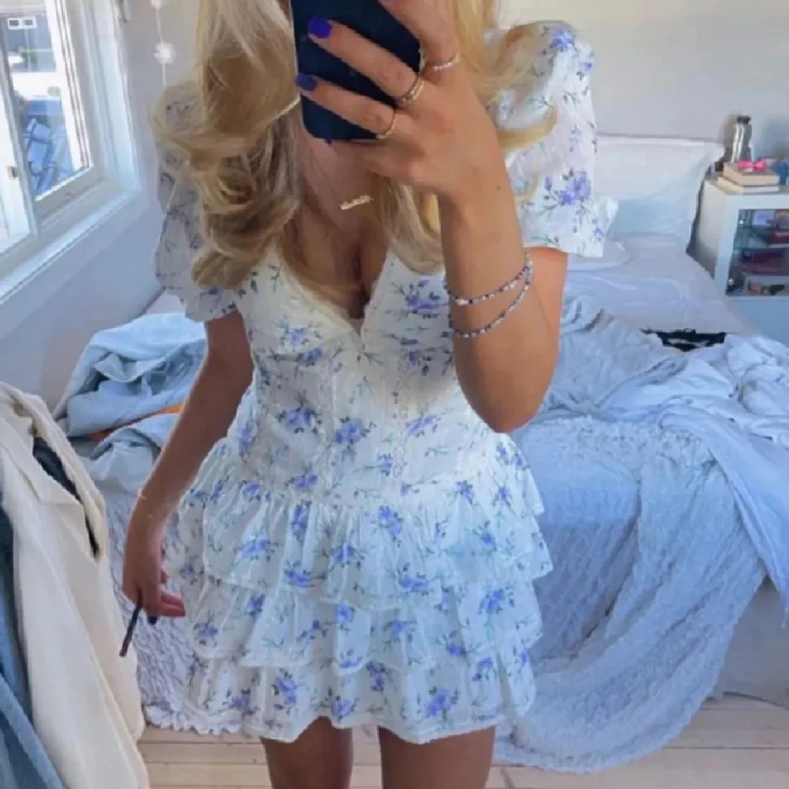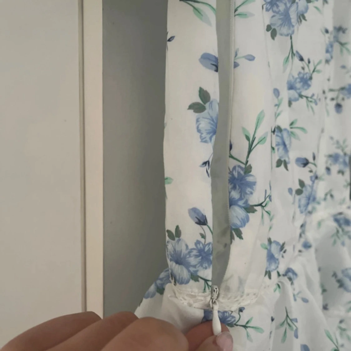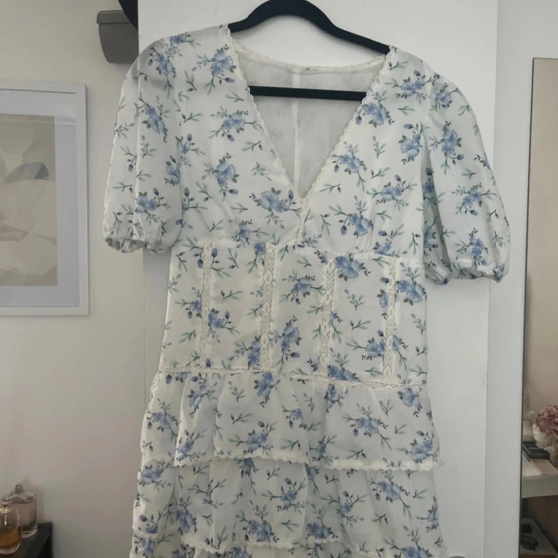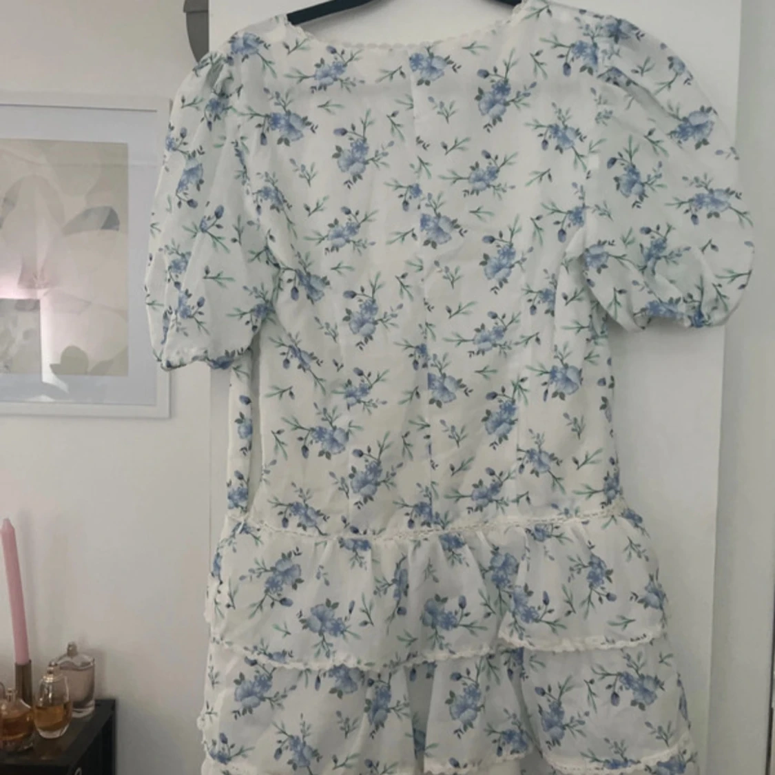 Supersöt kortklänning i vitt med blått blommönster och volanger. Klänningen har v-ringning, puffiga korta ärmar och dragkedja i sidan. Jättebra skick!
