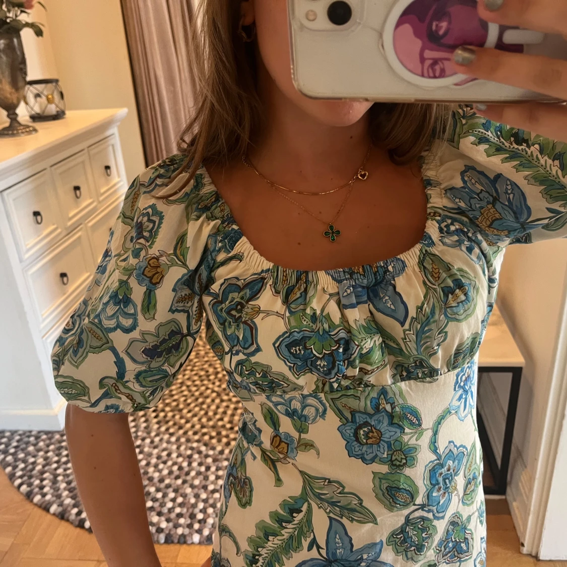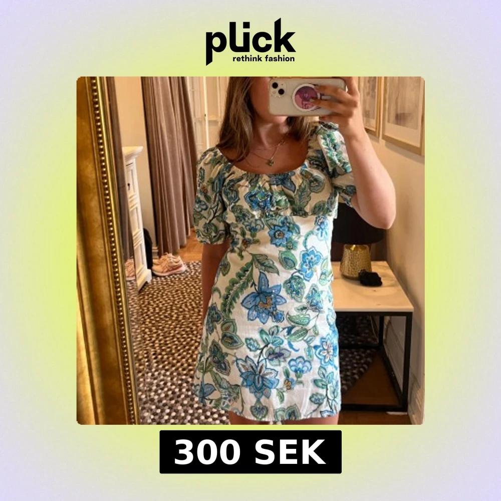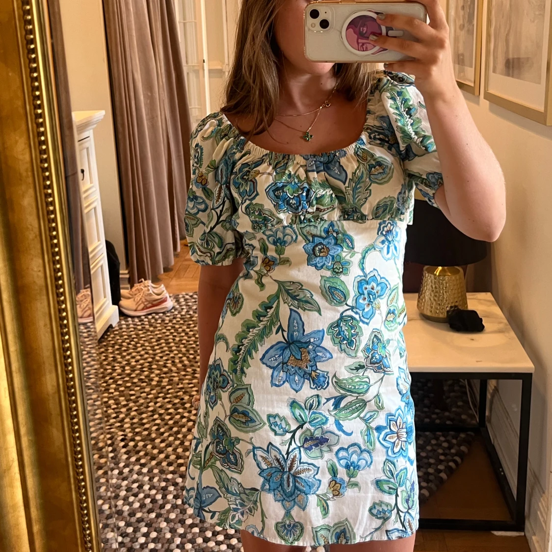Superfint kort klänning från mango med massa blommor på sig. Den är öppen i ryggen som man knyter med rosett! 🩵💛.