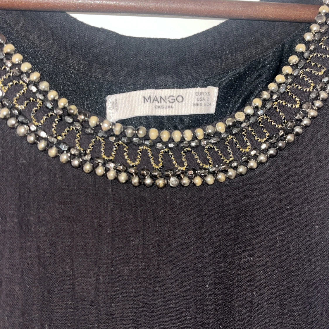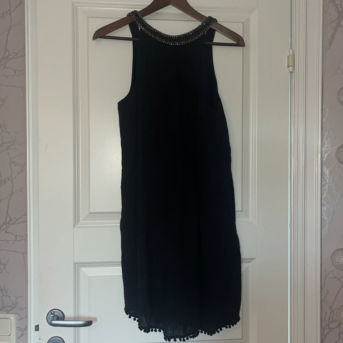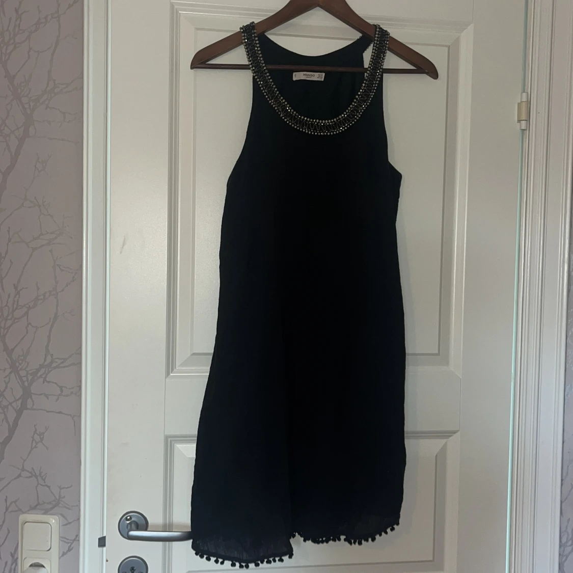 Svart klänning från Mango med snygg pärl- och paljettdekor runt halsringningen. Klänningen har en rak passform och avslutas med små bollar längs fållen för en extra detalj.