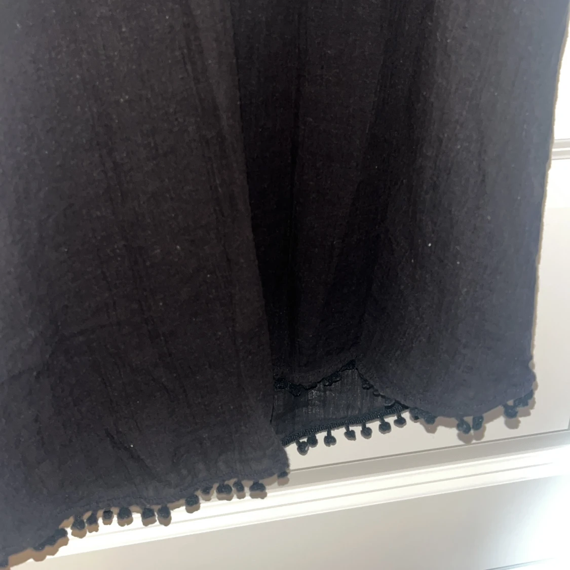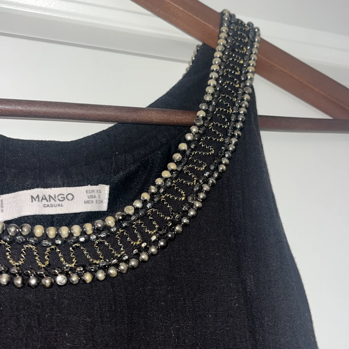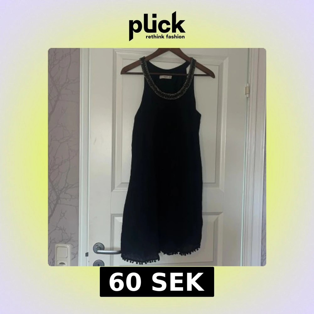 Svart klänning från Mango med snygg pärl- och paljettdekor runt halsringningen. Klänningen har en rak passform och avslutas med små bollar längs fållen för en extra detalj.