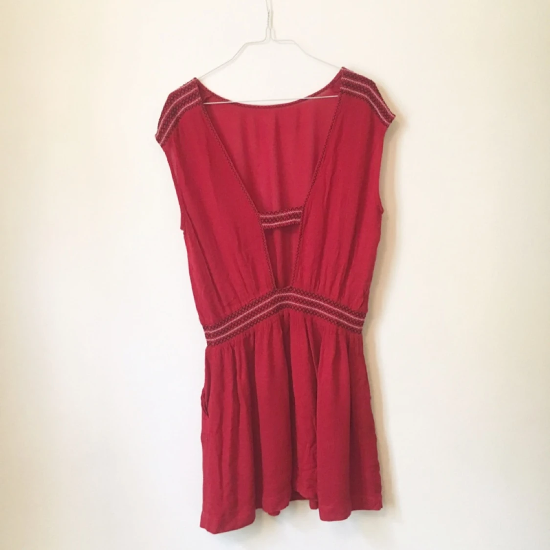 En röd bomullsklänning från Mango. Resår i midjan och djupt V-ringad i ryggen. Bandet i ryggen täcker fästet om man vill bära Bh! 👌