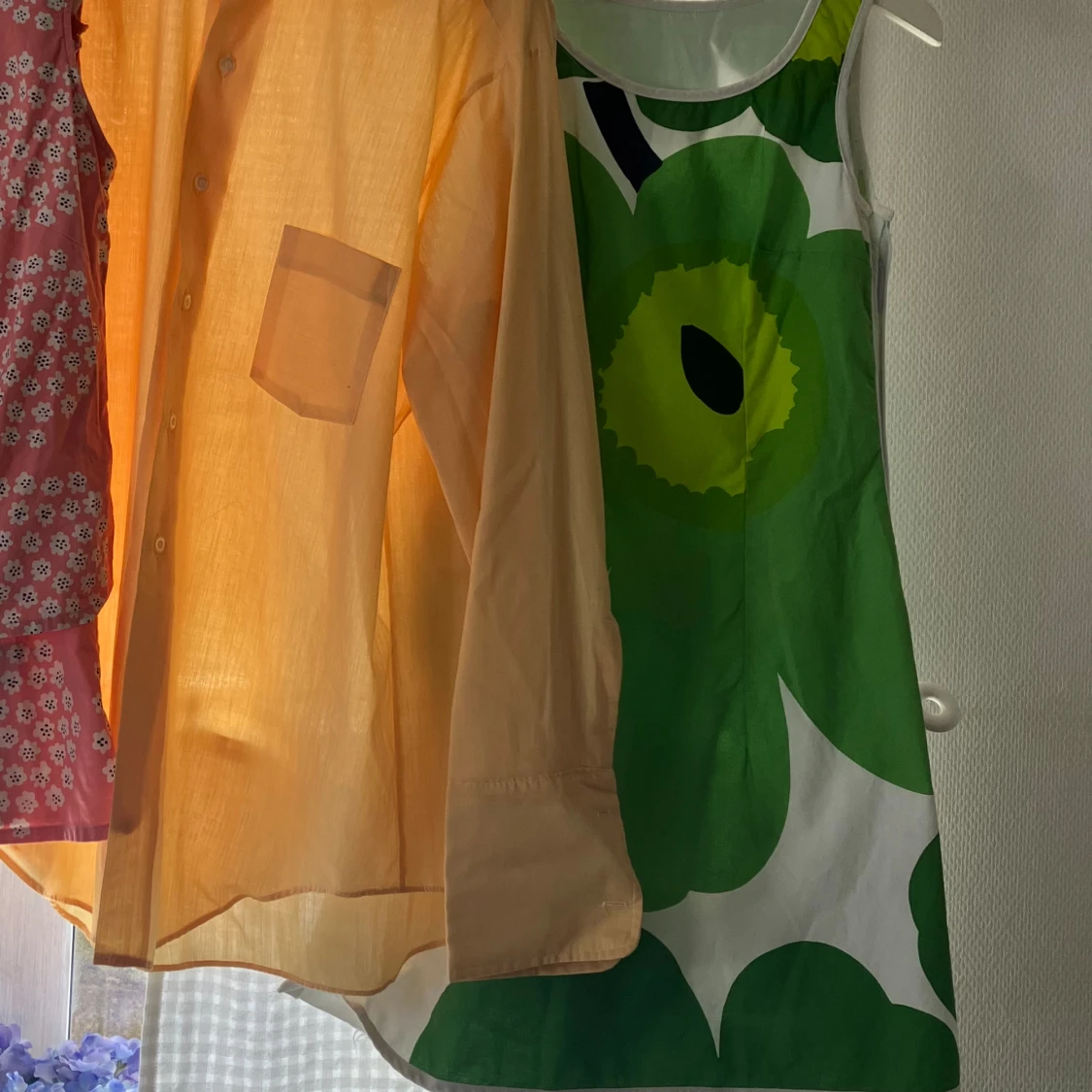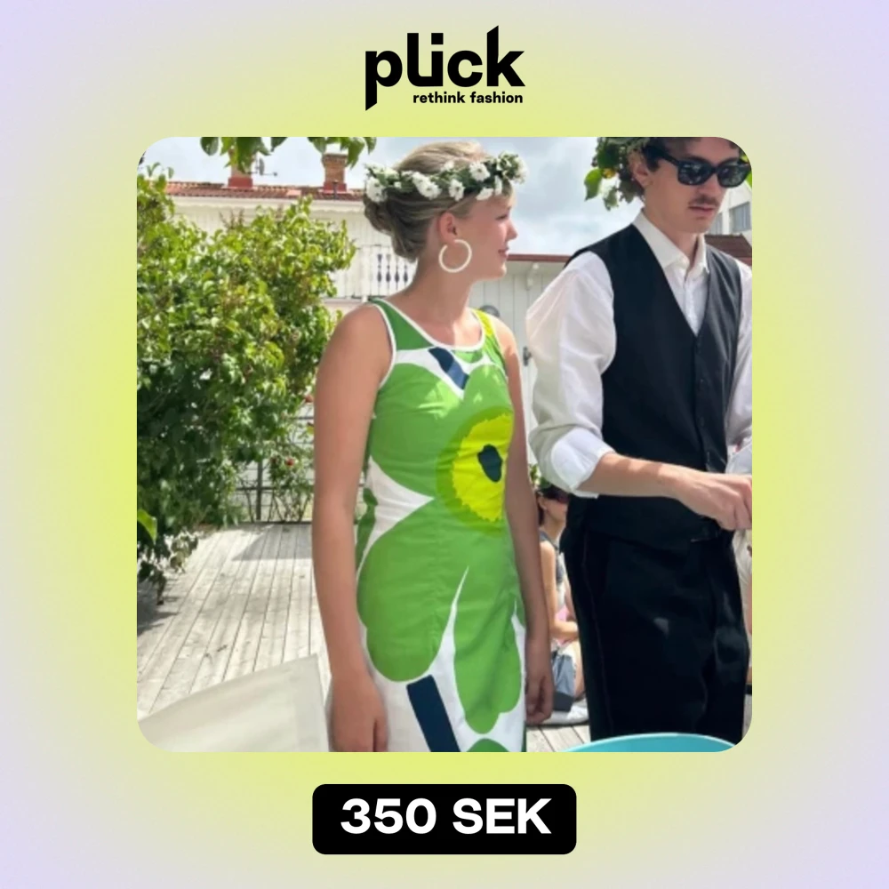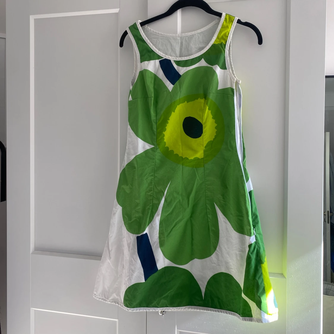 En klänning jag har köpt av en kvinna som sytt den själv av marimekko-tyg, jättebra skick, kan maskintvättas och så så fin!!