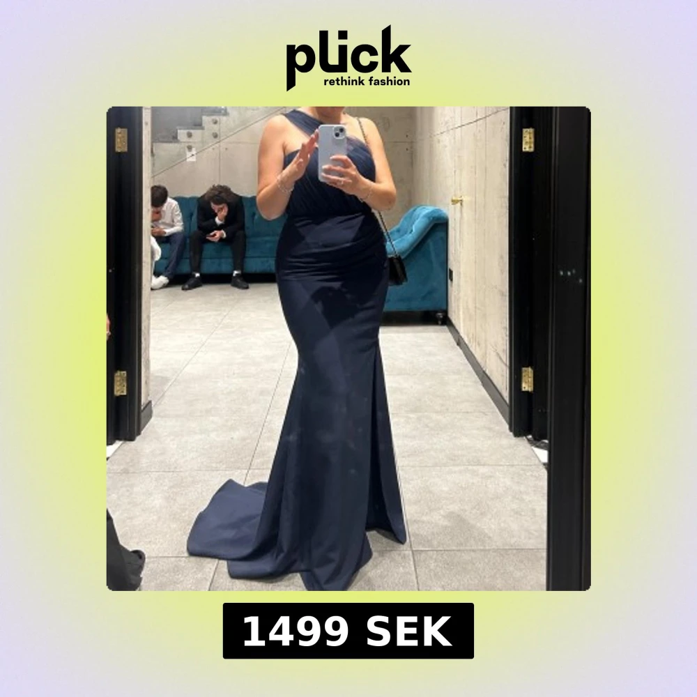 Elegant marinblå långklänning med en stilren oneshoulder-design och en smickrande slits framtill. Perfekt för en kväll ute eller en speciell tillställning. Klänningen har en figurnära passform som framhäver silhuetten. Endast använd en gång, stl 38 🥰