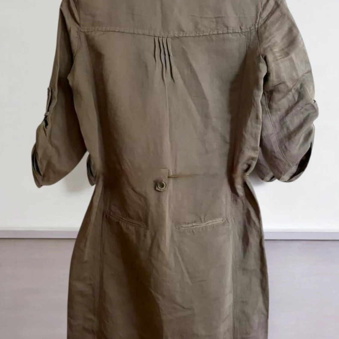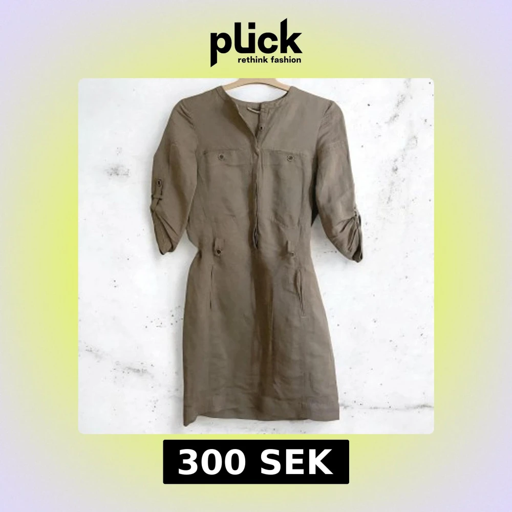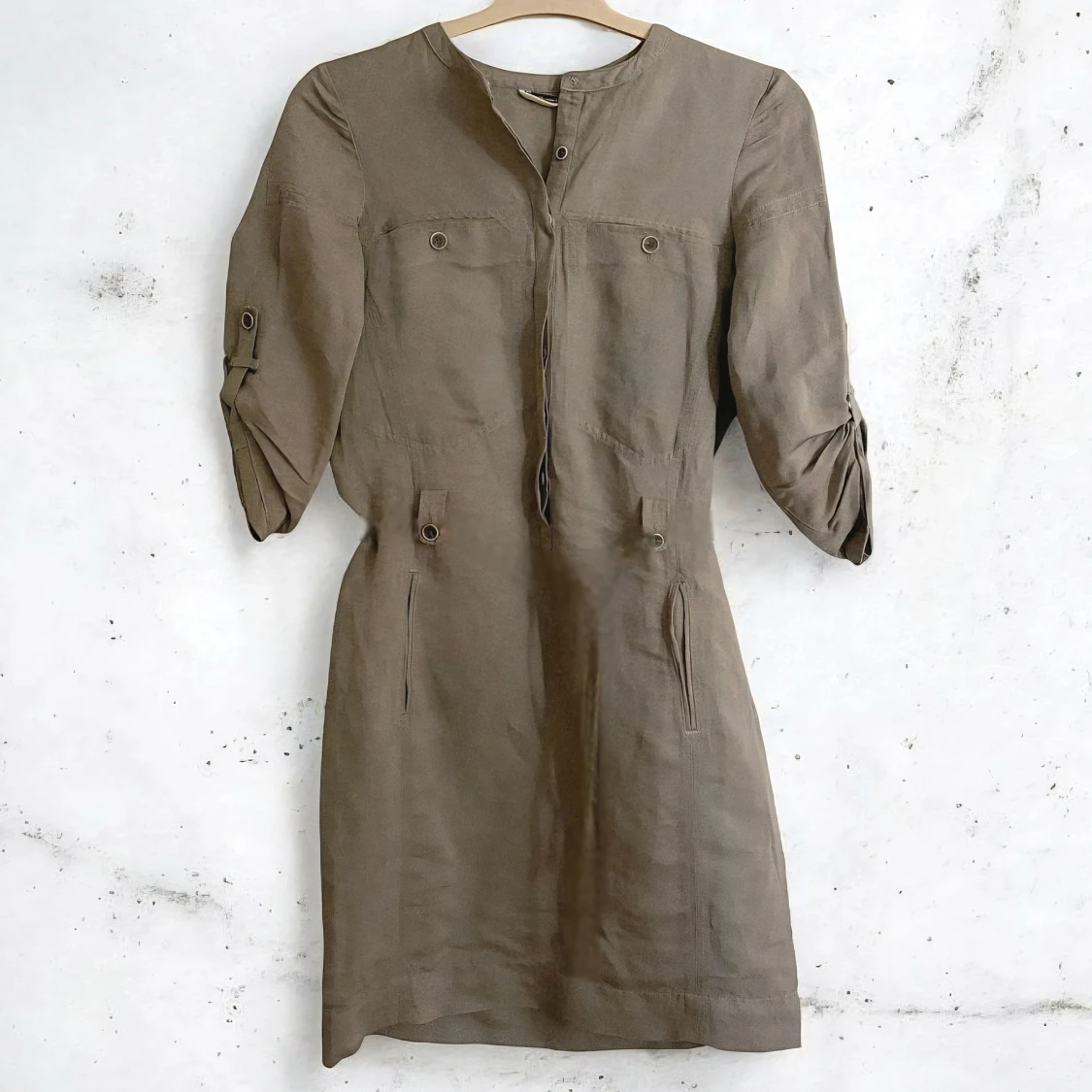 Stilren khaki brown kortklänning i linne från Massimo Dutti med trekvartsärmar som kan rullas upp och fästas med knapp. Klänningen har dragkedja framtill, dekorativa fickor och markerad midja med detaljer. Perfekt för en avslappnad men snygg look.