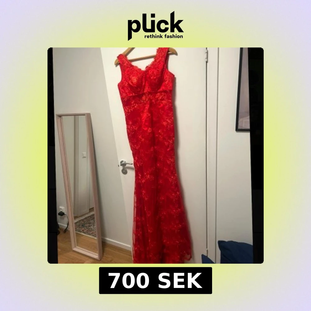 Säljer en röd långklänning med v-ringad fram och djup öppen rygg. 🥰💕Klänningen har spetsdetaljer och blommigt mönster över hela tyget. Figurnära passform, perfekt för bal eller fest. Fint skick, pris går att diskutera!