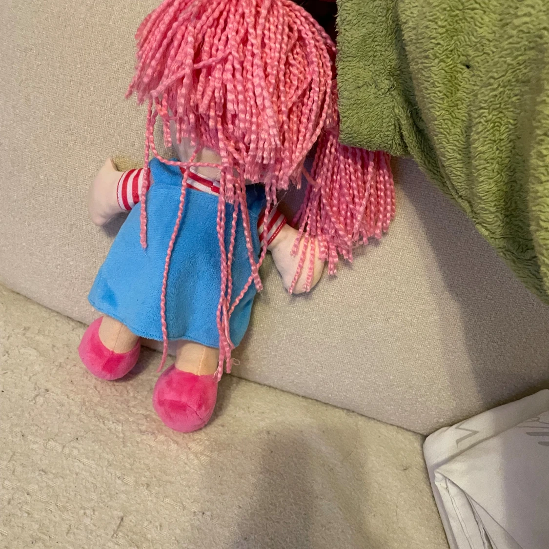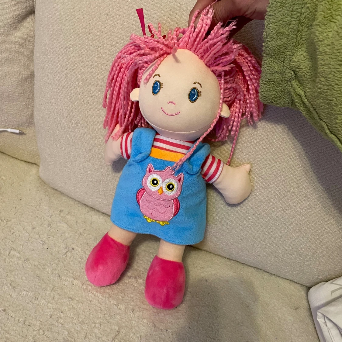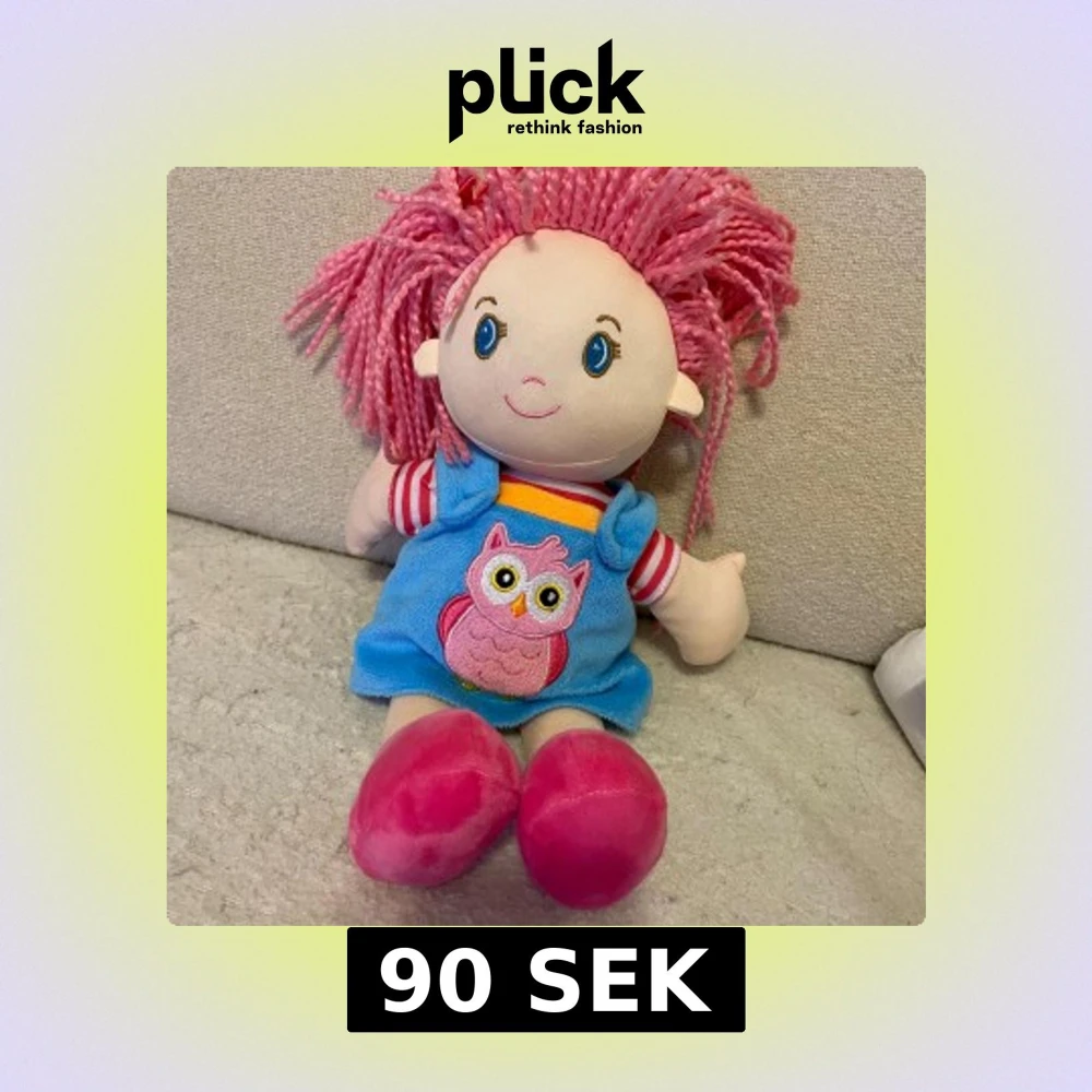 Mjukdocka med rosa hårSöt mjukdocka med rosa garnhår och en blå klänning med en uggla på. Dockans längd är cirka 32cm